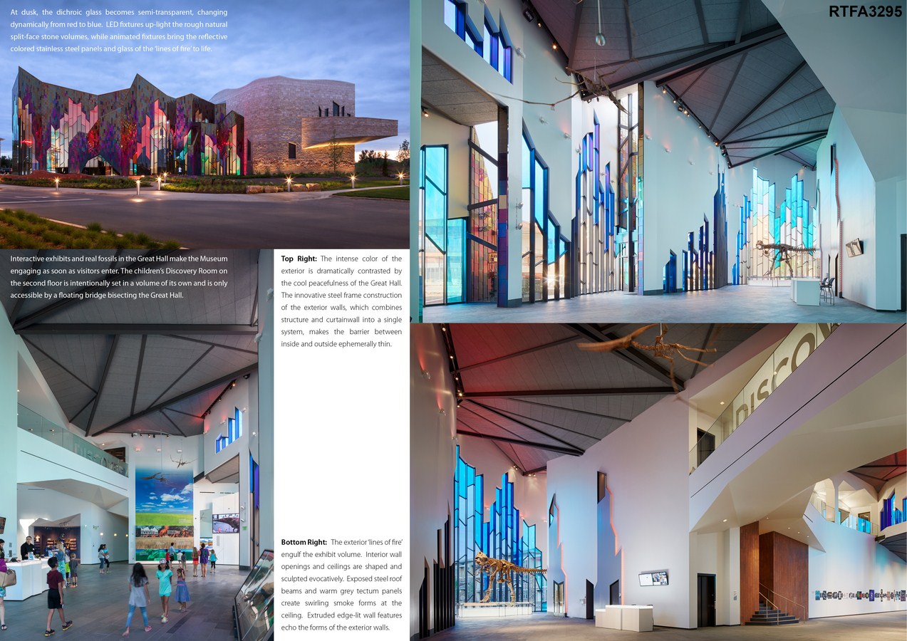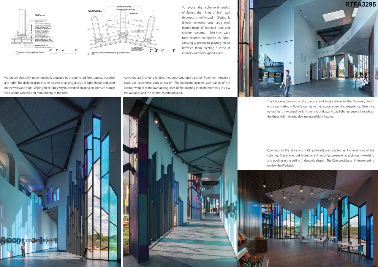 Rejecting a confrontational approach to jar the visitor, the colorful and sculptural design, embodying historic yet still current regional practices, strives to celebrate the unique beauty of the region. The cutting-edge insulated dichroic glass was developed exclusively for this project, and is considered the first application of its kind in North America. Its unique color-changing properties and reflective, shifting appearance entice people and give them the illusion of being engulfed in flames. The exterior wall system innovatively fuses structure and standard curtainwall into a single thin custom system, evoking the ephemeralness of fire. In contrast to the vibrant exterior, the column-less, cathedral-like interior, coupled with the calming, cool blue and purple dichroic-transmitted light, imparts a peaceful sense of awe. By this positive visceral engagement, the visitor gains a sense of connection to and pride in the place.