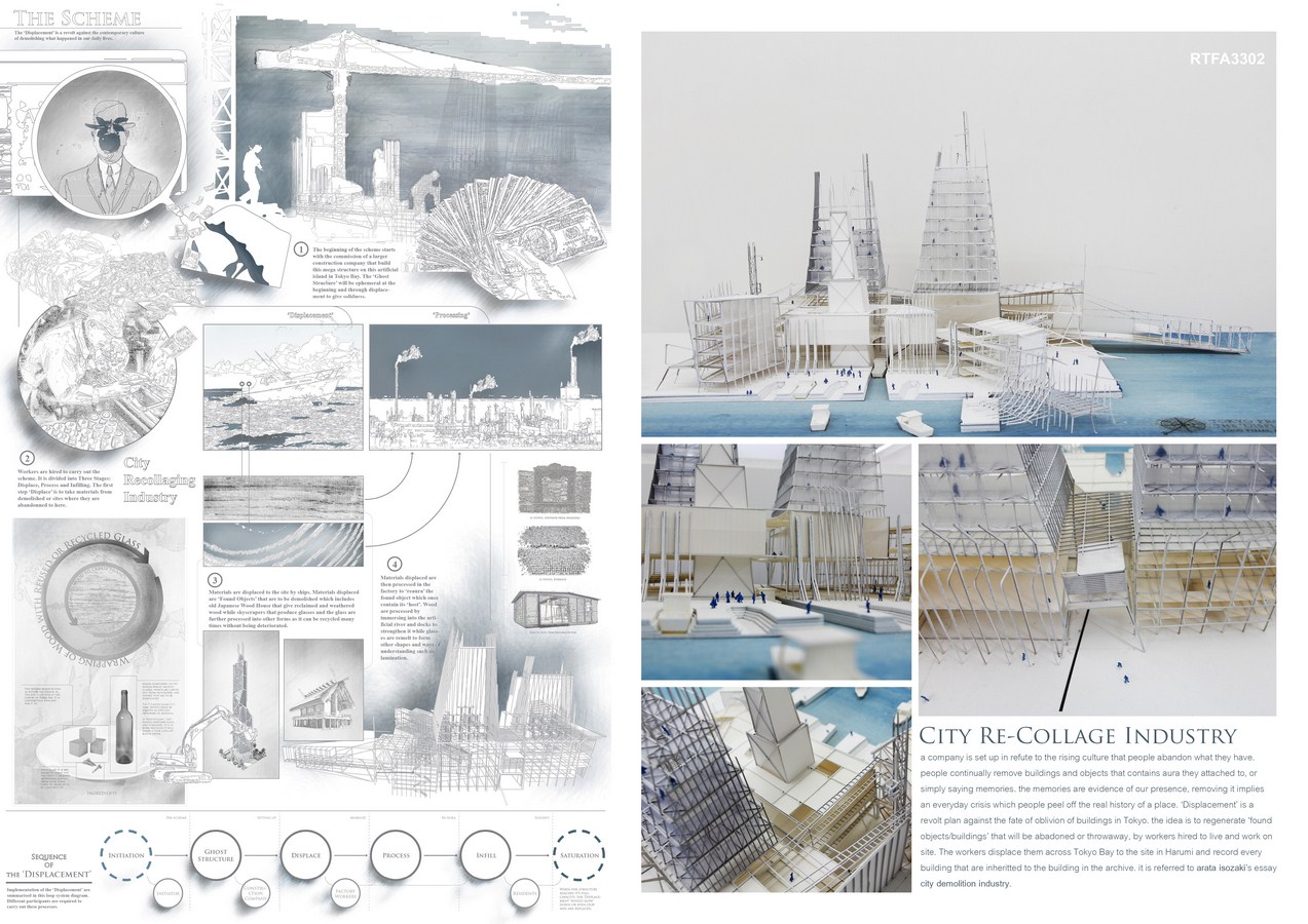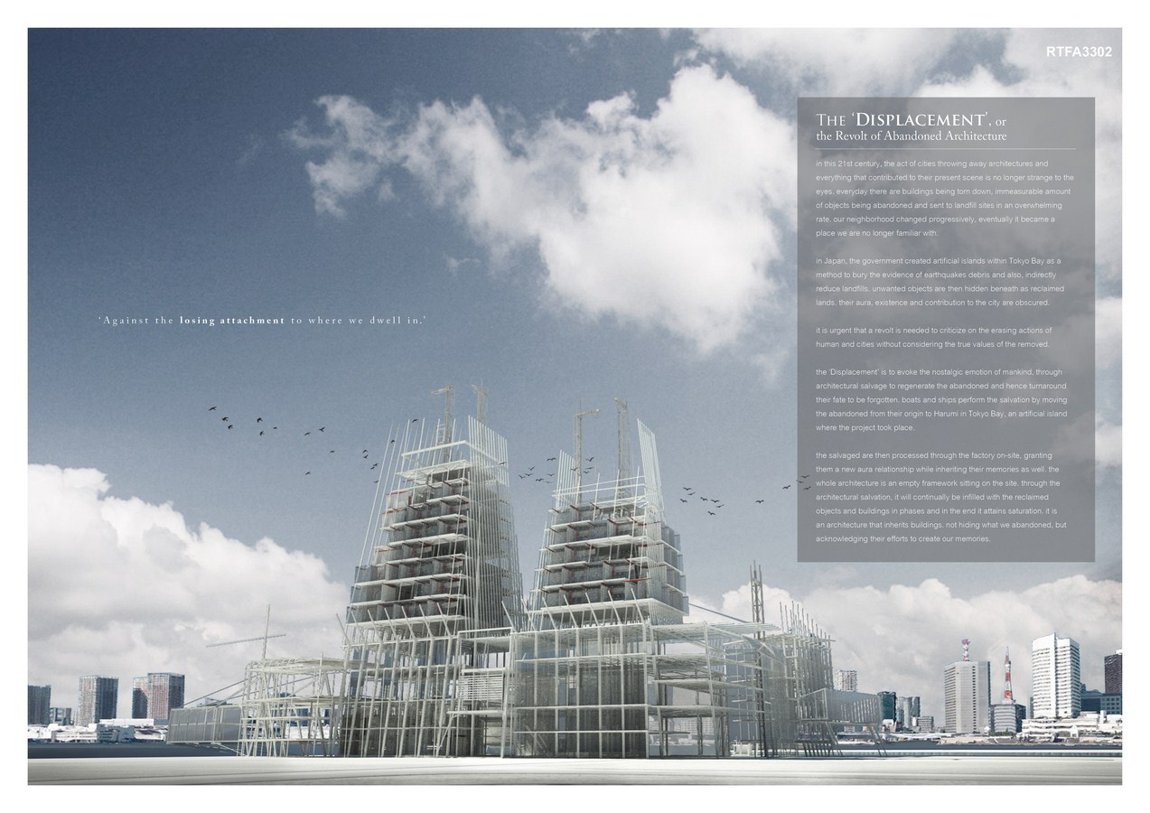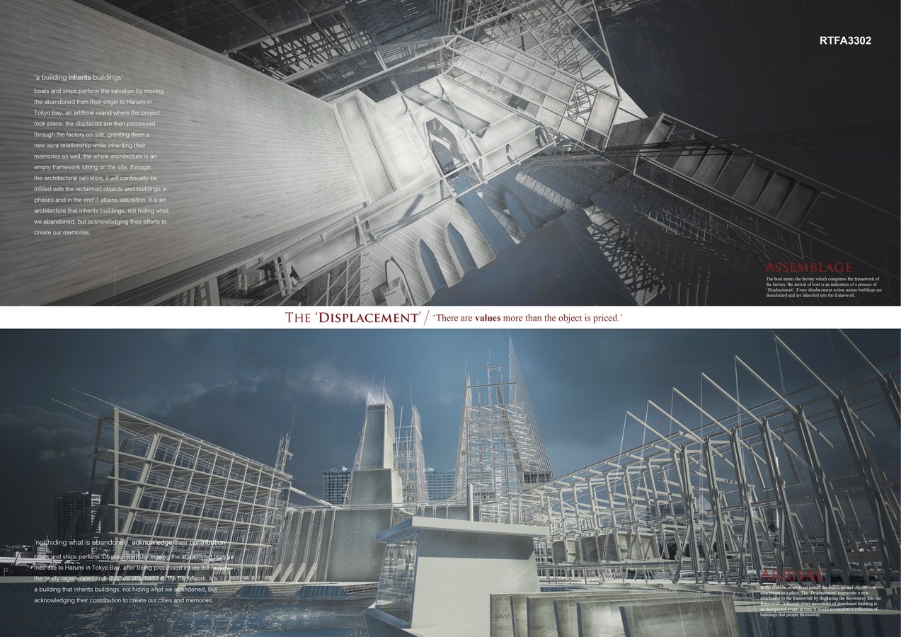 The ‘Displacement’ is to evoke the nostalgic feeling of people, through architectural salvage to regenerate the abandoned and hence turnaround their fate to be forgotten. Boats and ships perform the salvation by moving the abandoned from their origin to Harumi in Tokyo Bay, an artificial island where the project took place. The salvaged are then processed through the factory on-site, granting them a new aura relationship while inheriting their memories as well. The whole architecture is an empty framework sitting on the site. Through the ‘Displacement’, it will continually be filled with the reclaimed objects and buildings in phases and in the end it attains saturation. It is an architecture that inherits buildings. Not hiding what we abandoned, but acknowledging their efforts to create our memories.