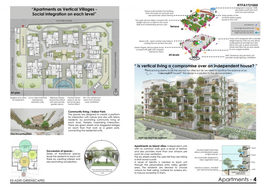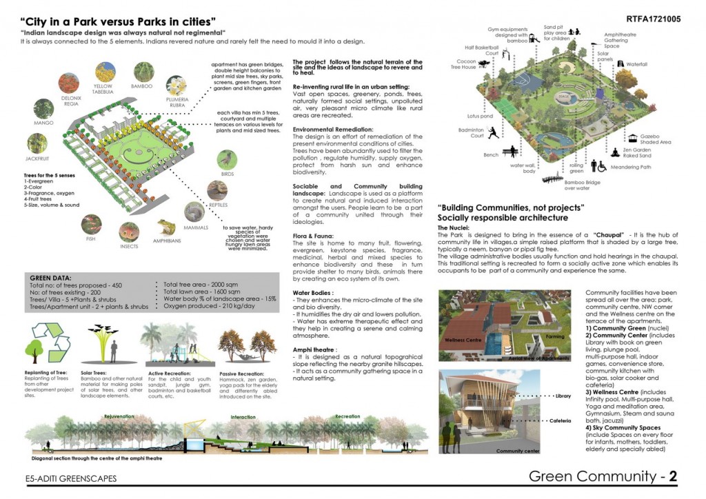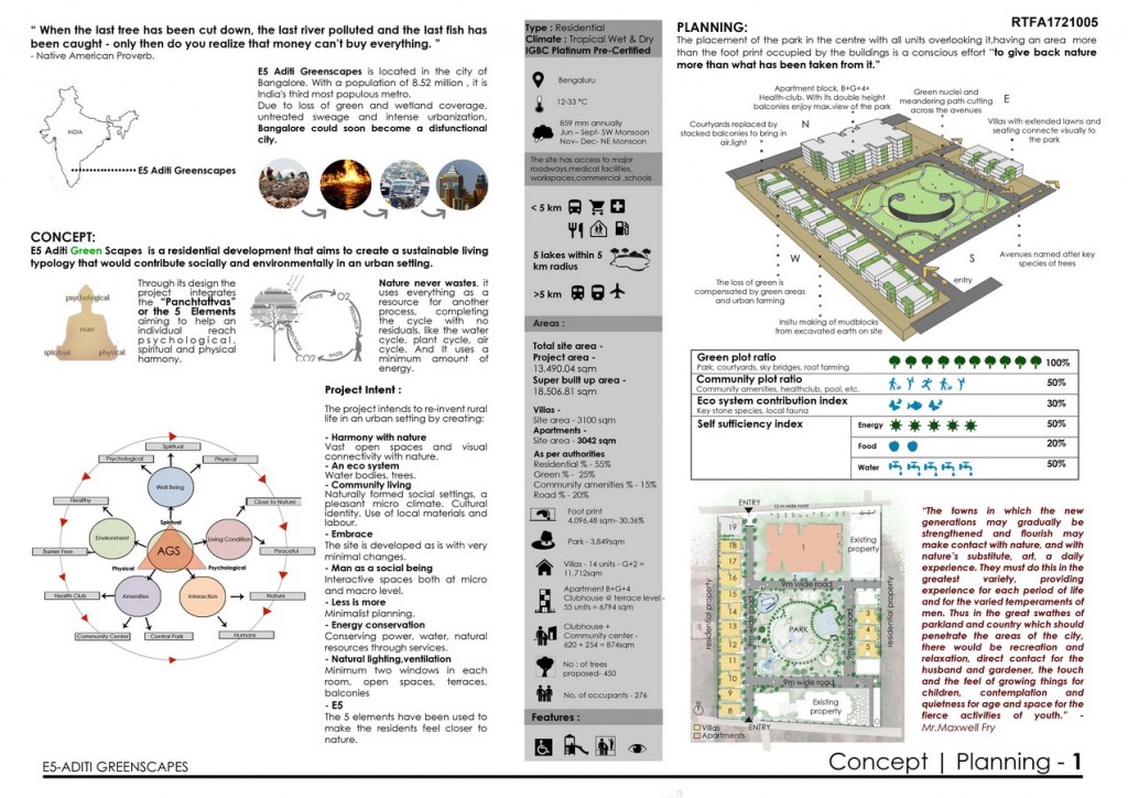 E5 – Aditi Greenscapes is a concept for a private residential development on a 4.375 acre plot in North Bangalore. The project has been designed as a self-sufficient urban village incorporating and enhancing the building and social traditions, respecting nature and run on low energy.