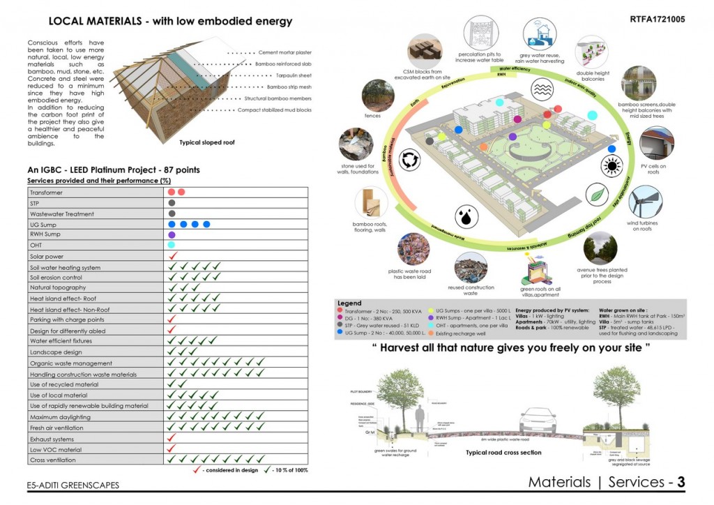 Resource and environmental performance- Planet and prosperity: The project is designed to use all that is available freely on site from Nature- soil for blocks, sun and wind for energy and rain for water. The buildings have been designed on solar passive principals thereby minimizing the energy, water and other requirements to run the buildings. Solar PVs have been proposed to completely take care of common area lighting and partial energy requirements for the 69 dwelling units. Major building materials used – Mud, bamboo and bamboo composites, stone and waste with low embodied energy, minimizing the Carbon footprint of the project. The landscape uses indigenous and hardy varieties of trees and plants and recycled water for landscape and water bodies. A water treatment plant and RWH are proposed.