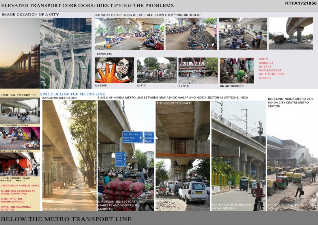 The rapidly changing phases of the cities have encouraged the elevated transportation corridor leaving behind the architects and urban clueless about the value of land which is wasted below these corridors. In this proposal, the designers are trying to explore the possibility and commercial use of this space under the elevated corridors. To carry out the research proposal, a case study of Noida greater Noida metro line (Delhi NCR, India) has been selected. A detailed documentation of the space available below this Metro-line has been done to accomplish the aim.