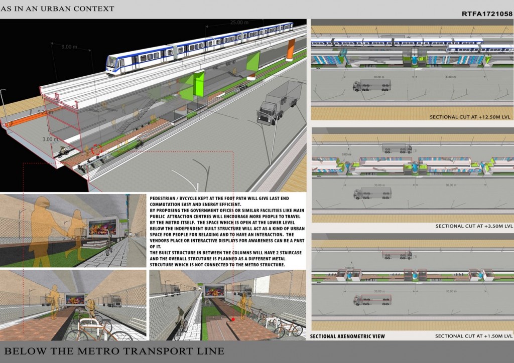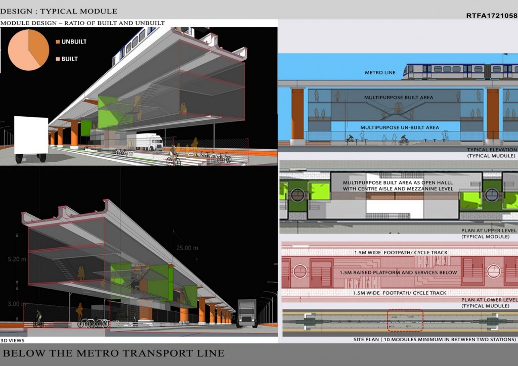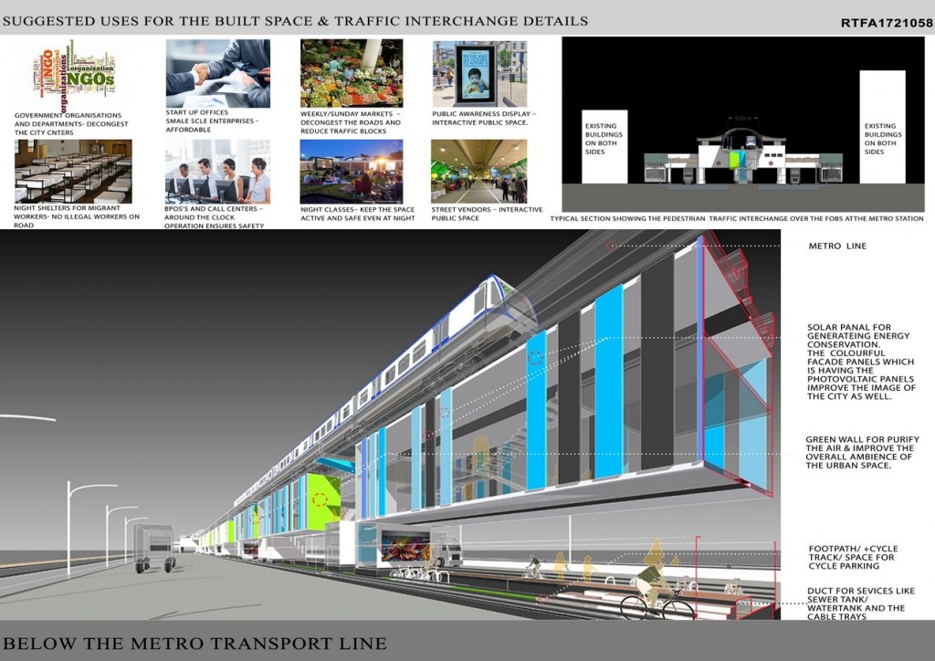 The study reveals that these areas are underutilised due to the fact that the space has more of a vertical dimension than a horizontal one. This restricts the desired use of the potential land under the elevated transportation corridor. The research and proposal aims at, a design solution which can act as a prototype, that would improve the commercial value of this place while at the same time would reduce the level of congestion, due to both vehicular and pedestrian movement, at the metro stations at the peak hours. The designers proposes that these spaces by it can act as a connectivity lines between stations and at the same time small offices and commercial spaces can be created beneath these pockets. This would avoid the chaos caused at the metro stations for the last mile connectivity and travel.