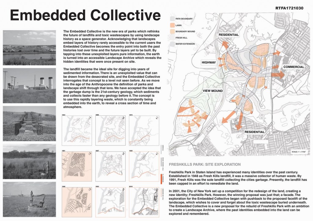 The Embedded Collective is the new era of parks which rethinks the future of landfills and toxic wastescapes by using landscape history as a space generator. Acknowledging that landscapes embed layers of history rarely accessible to the current users the Embedded Collective becomes the entry point into both the past histories lost over time and the future layers yet to be built. By tapping into these unexploited layers pure information, the earth is turned into an accessible Landscape Archive which reveals the hidden identities that were once present on site.