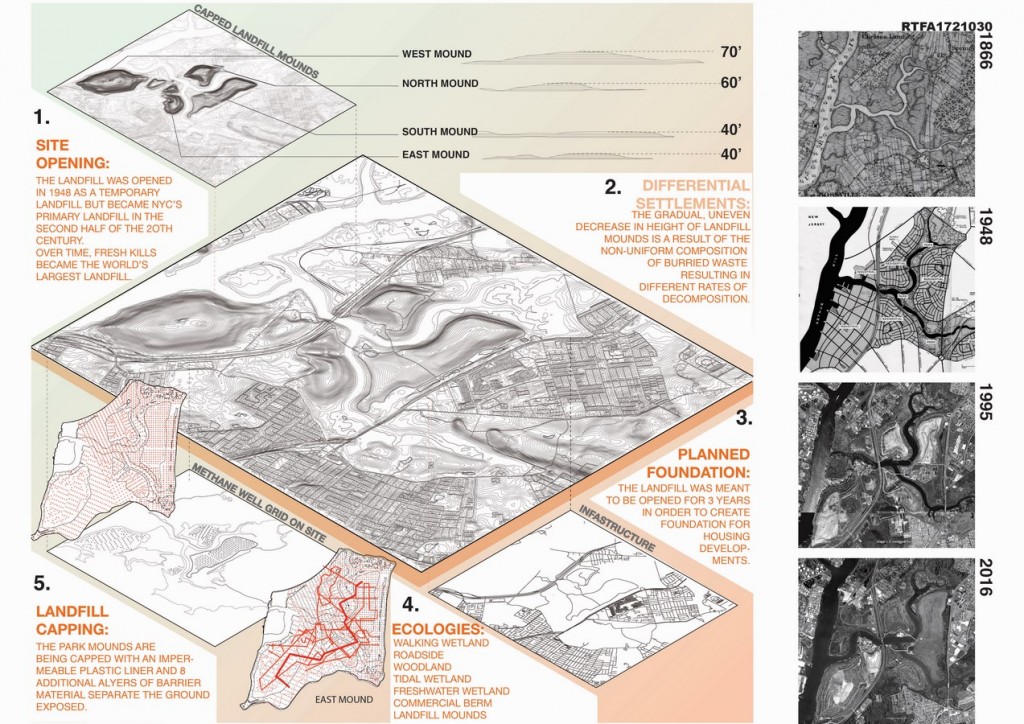 Freshkills Park in Staten Island has experienced many identities over the past century. Established in 1948 as Fresh Kills landfill, it was a massive collector of human waste. By 1991, Fresh Kills was the sole landfill collecting the cities garbage. Presently, the landfill has been capped in an effort to remediate the land.
