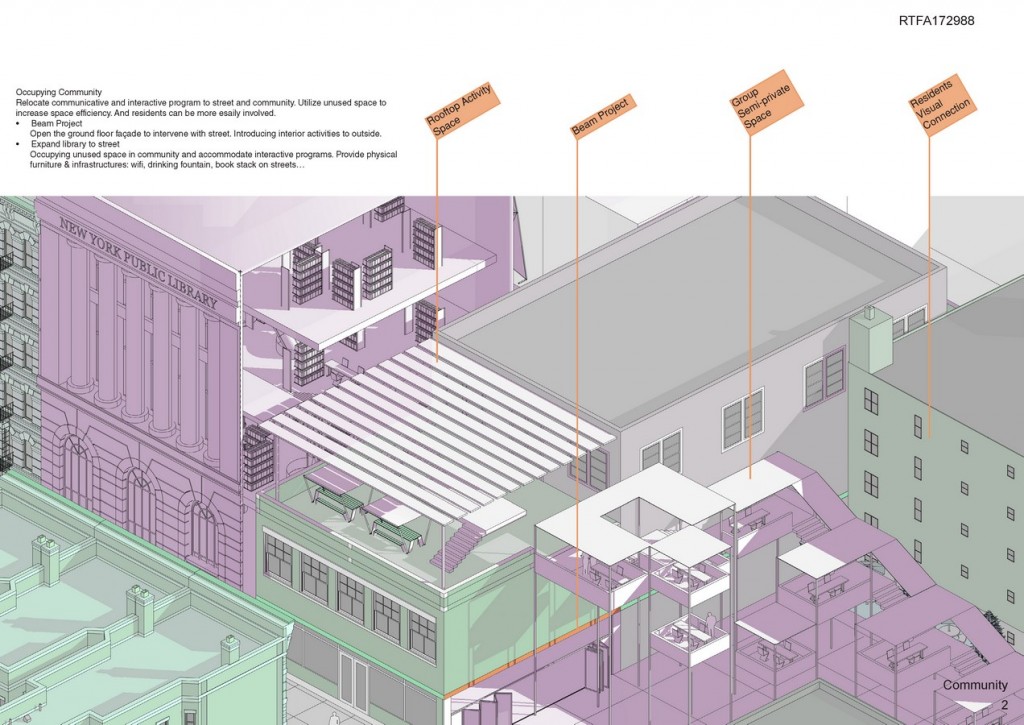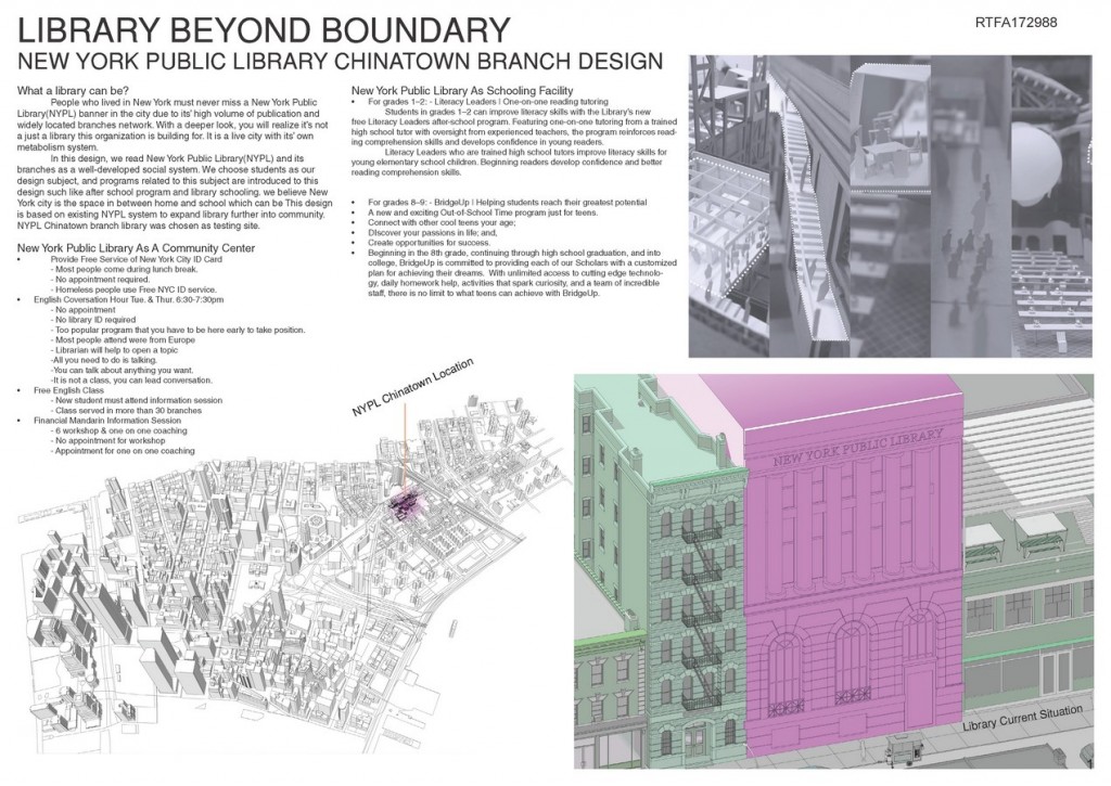In this design, we read New York Public Library and its branches as a well-developed social system. We choose students as our design subject, and programs related to this subject are introduced to this design such like after school program and library schooling. we believe New York city is the space in between home and school which can be This design is based on existing NYPL system to expand library further into community. NYPL Chinatown branch library was chosen as testing site. By creating strategies such as green carpet, open-up backhouse, beam project, we populate the community with current library programs and increase resident involvement.