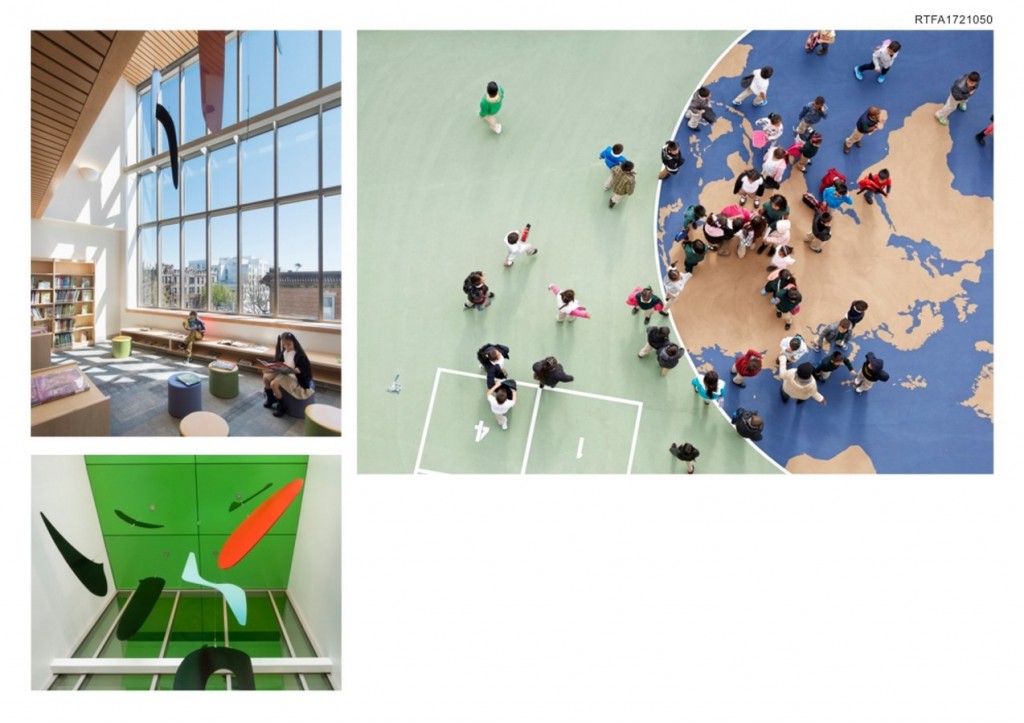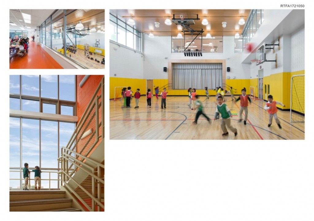 Design elements throughout the school respond to a child’s perspective and scale. Hallway and stairway areas combine with abundant transparent walls and exterior views to enable children to orient themselves intuitively, and color-coded floors simplify way-finding. Glass curtain walls at the corner stairways afford views of planes taking off from nearby LaGuardia Airport and the 1939 and 1964 World’s Fair grounds. The interiors contribute to an atmosphere of wellbeing with wood-slatted ceilings that evoke a sense of warmth, and color palettes with accents that indicate various programmatic functions.