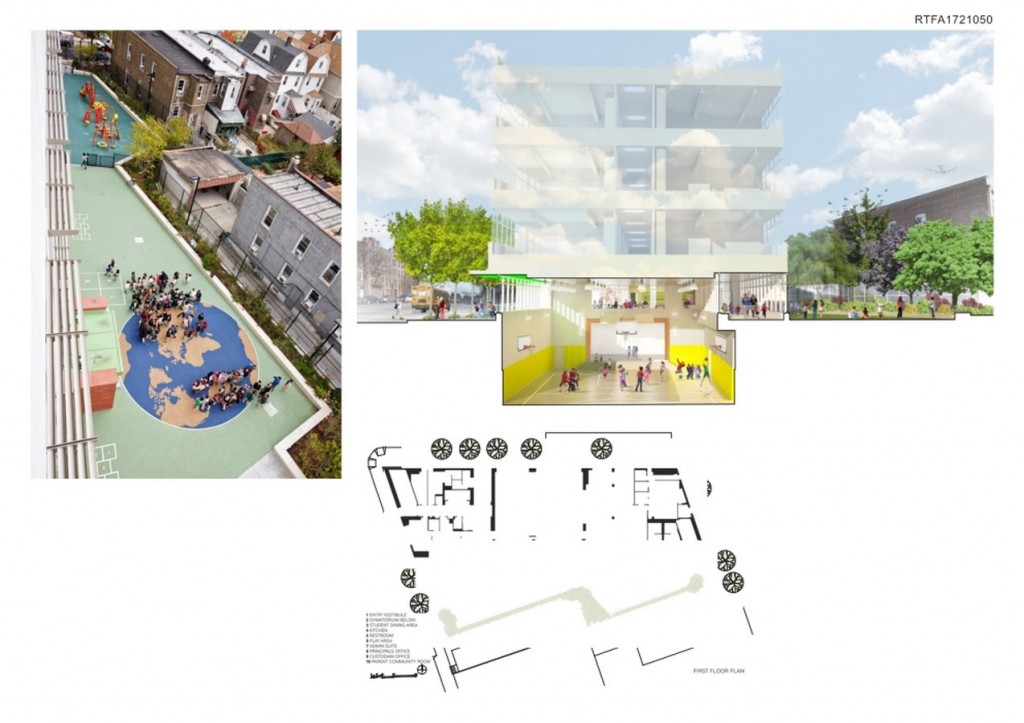 Public School 330, built under the auspices of the New York City School Construction Authority (SCA) to serve Grades Pre-K through 5th, is a four-story, light-filled building that spans a city block. The school’s contemporary street presence, which features a streamlined façade punctuated with grouped windows and transparent corner stairways, was achieved by obtaining a variance from the SCA’s regulation brick cladding: instead, the architect substituted precast concrete panels hung above a low base of red brick. Erected in two weeks without scaffolding, the substitution allowed for faster construction and provided an opportunity for formal expression that conveys the design’s progressive character. Designed to embrace its specific context at the head of Northern Boulevard in Queens, PS330Q serves as a civic amenity, providing a new public realm and nurturing healthy community interactions.