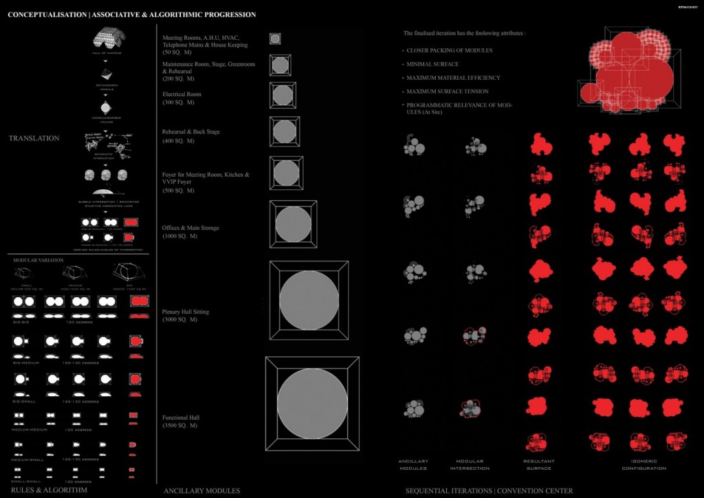 This study examines and investigates various properties and phenomena associated with soap bubble intersection in nature. The investigated properties act as driving rule for the form generative process. The rules along with the functional requirements for the program formed an algorithm which led to the global form of the structure through the local modules employed and intersected as per the functional needs. The design resulted in a variety of sequential iterations.