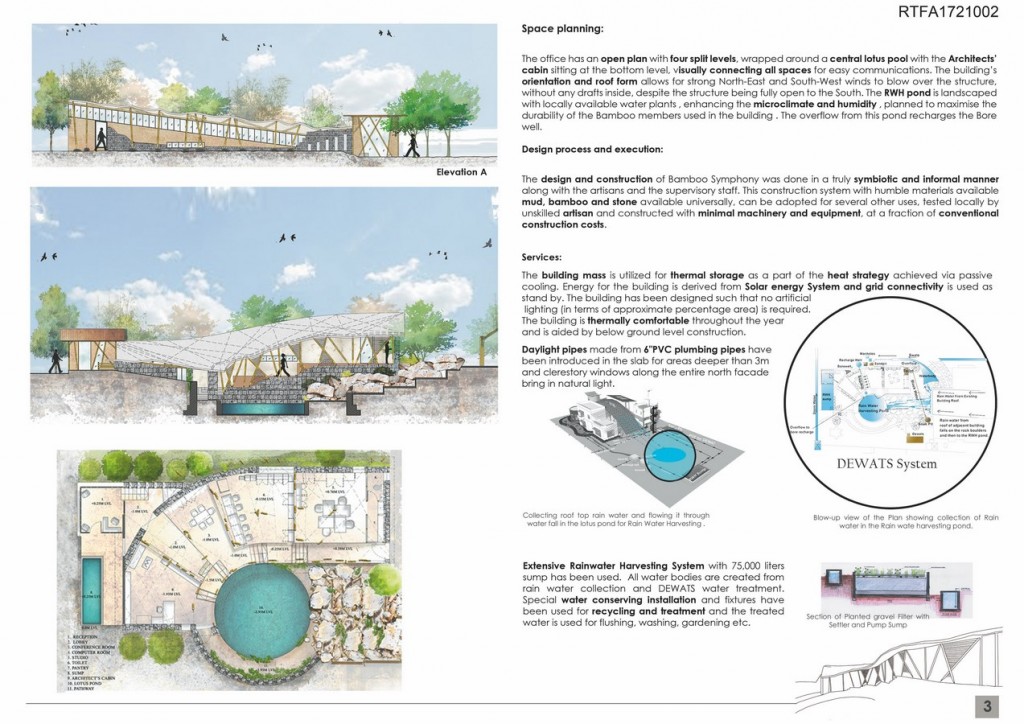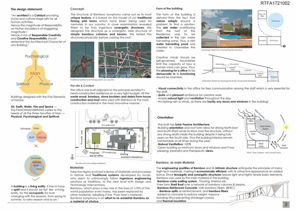 Our office Bamboo Symphony is the major project presented depicting our principles, the symbiotic character and culture of Bamboo and the physical, chemical, ecological and environmental properties of materials expressed in the architecture as form, function and aesthetics of the building. The building connects the past to the future.