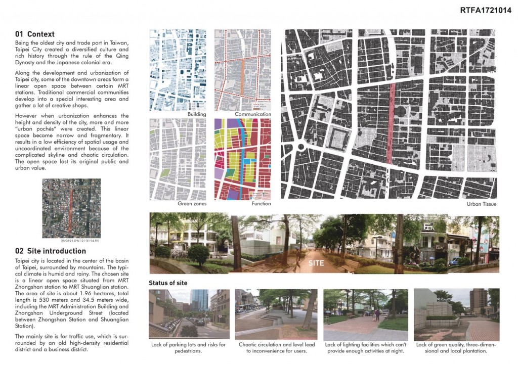 Taipei city is located in the center of the basin of Taipei. The chosen site is a linear open space situated from MRT Zhongshan station to MRT Shuanglian station. The area of site is about 1.96 hectares, total length is 530 meters and 34.5 meters wide.