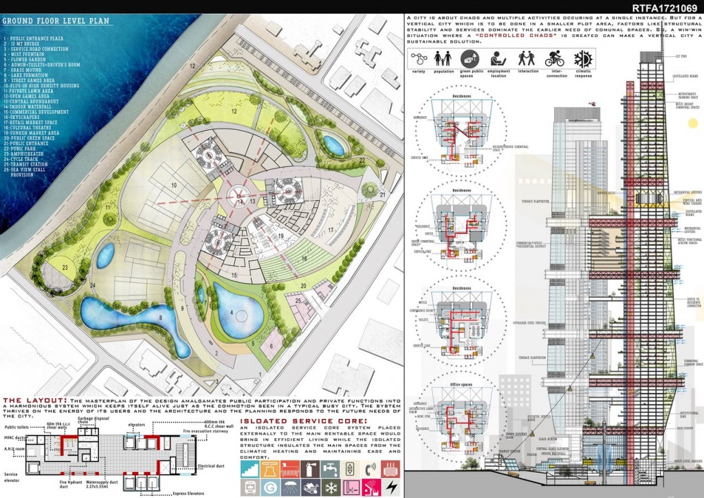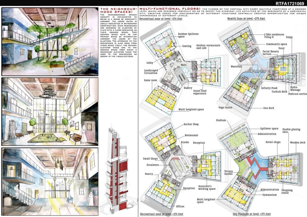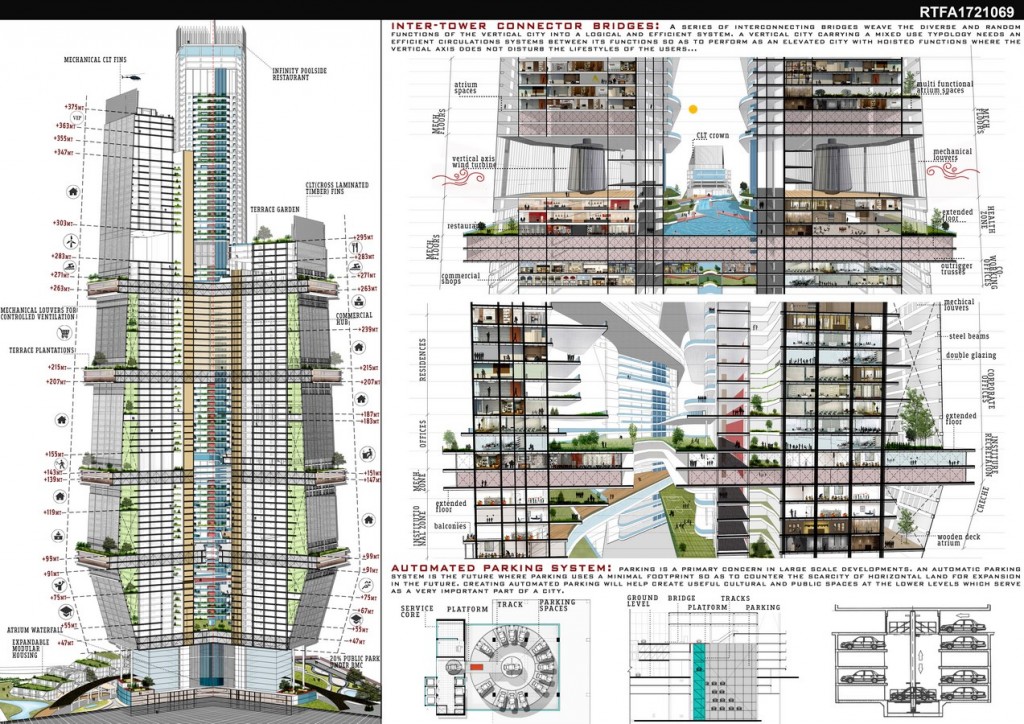 Imagining the Vertical City, is a concept aiming to develop a system which is not just a high end housing infrastructure but is a vessel that houses a justified complex network of functions present in a horizontal city hoisted vertically so as to create a similar ambience with a balance of comfort and elegance in the user’s lifestyle.