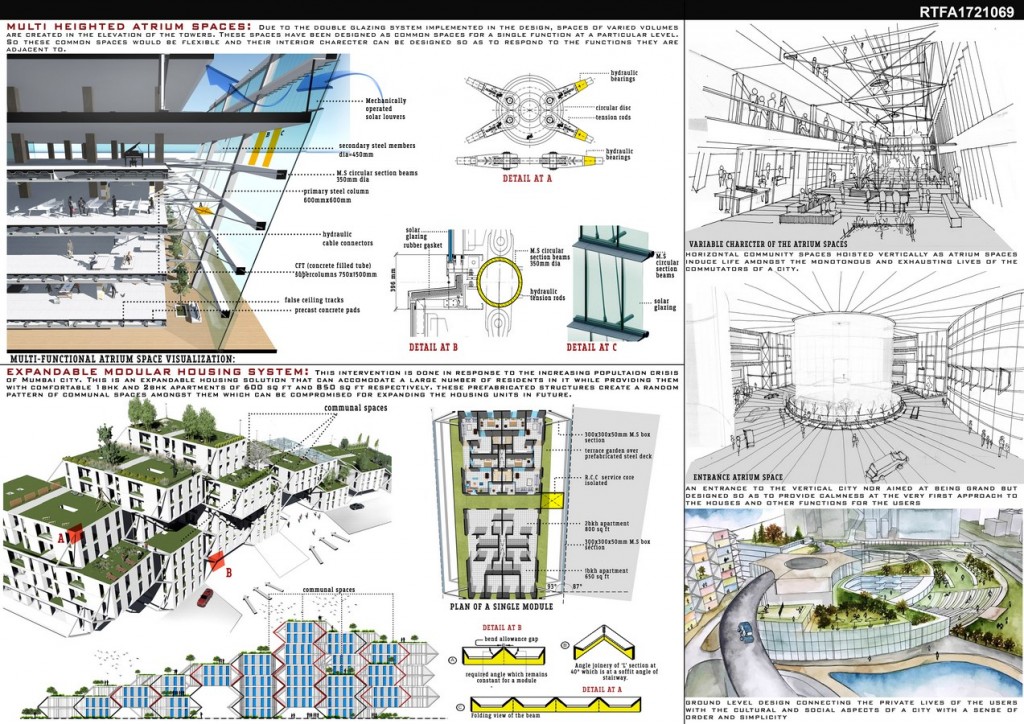 The design holds certain features like high density modular housing, transit hub, public spaces which are not seen in typical skyscrapers of Mumbai but are the core essence of a city. The design aims at being a modulated prototype solution for the future of Indian cities which can be multiplied to face the upcoming future urban challenges more efficiently. The design is dominated by the care taken to improve the lifestyles of the users in terms of efficiency and sustainability.
