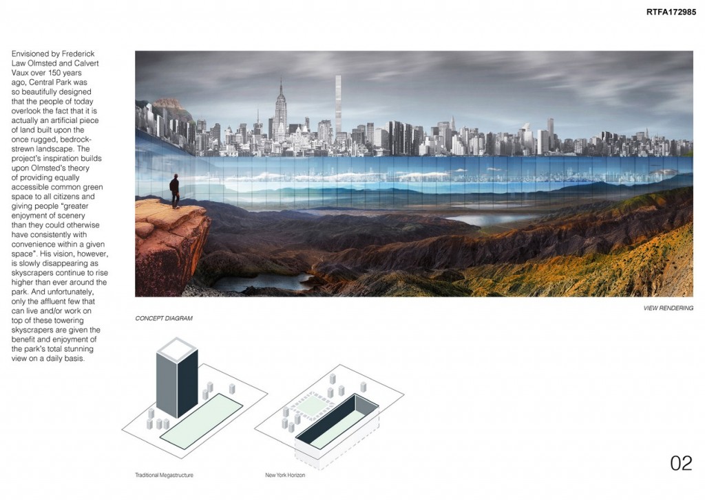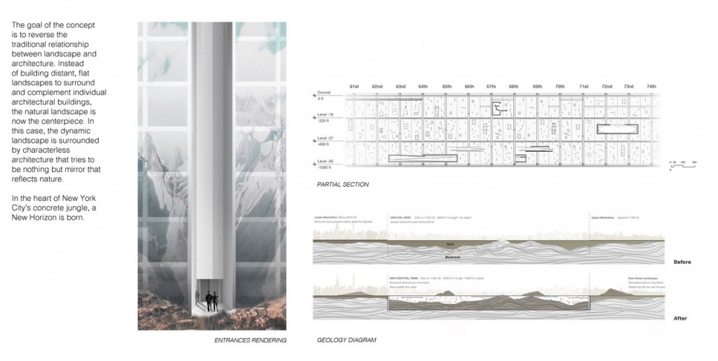 As the most densely populated county in America, Manhattan has always been a big fan of skyscrapers. Limited by its street grid, however, buildings in New York City are often skinny and tall. Rather than building upwards, “New York Horizon” envisions a new paradigm by digging downward to Central Park’s bedrock, which will reveal the park’s rugged natural terrain while also creating a continuous wall of skyscrapers around its periphery to house habitable spaces with unobstructed views of the new underground park.