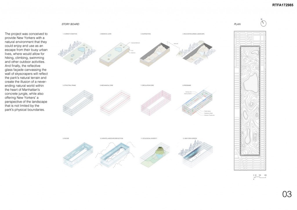 The project was conceived to provide New Yorkers with a natural environment that they could enjoy and use as an escape from their busy urban lives, where would allow for hiking, climbing, swimming and other outdoor activities. And finally, the reflective glass façade canvassing the wall of skyscrapers will reflect the park’s natural terrain and create the illusion of a never-ending natural world within the heart of Manhattan’s concrete jungle, while also offering New Yorkers’ a perspective of the landscape that is not limited by the park’s physical boundaries.