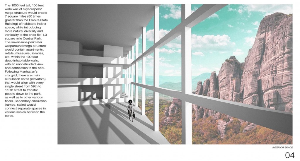 The 1000 feet tall, 100 feet wide wall of skyscrapers/mega-structure would create 7 square miles (80 times greater than the Empire State Building) of habitable indoor space, while introducing more natural diversity and verticality to the once flat 1.3 square mile Central Park. The seven-mile-perimeter wraparound mega-structure would contain apartments, retails, museums, libraries, etc. within the 100 feet deep inhabitable walls, with an unobstructed view and connection to the park. Following Manhattan’s city grid, there are main circulation cores (elevators) that would align with every single street from 59th to 110th street to transfer people down to the park, as well as to other various floors. Secondary circulation (ramps, stairs) would connect separate spaces in various scales between the cores.