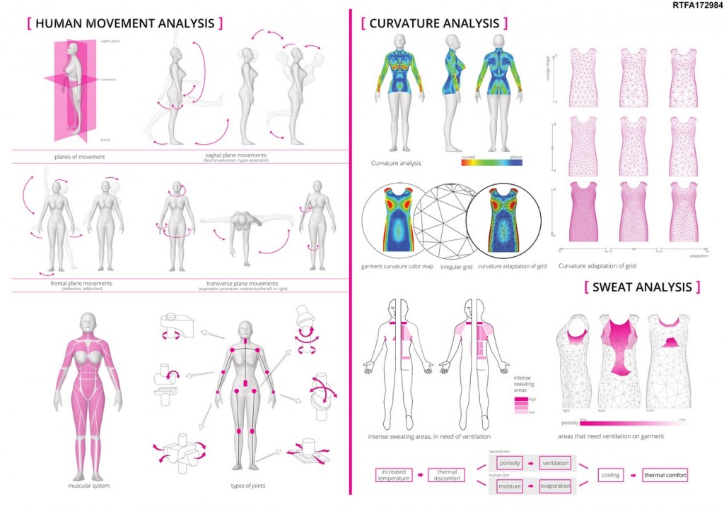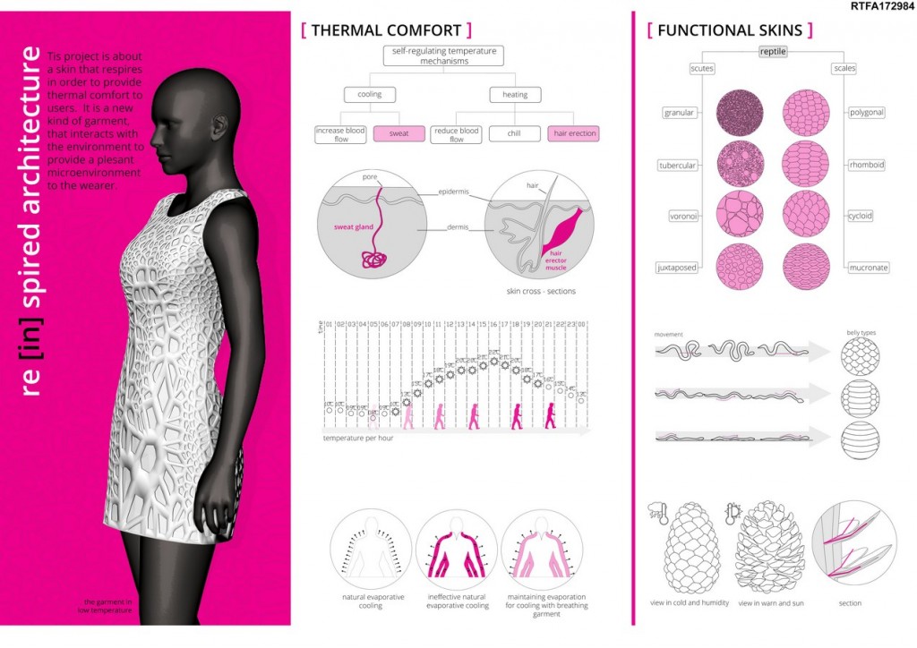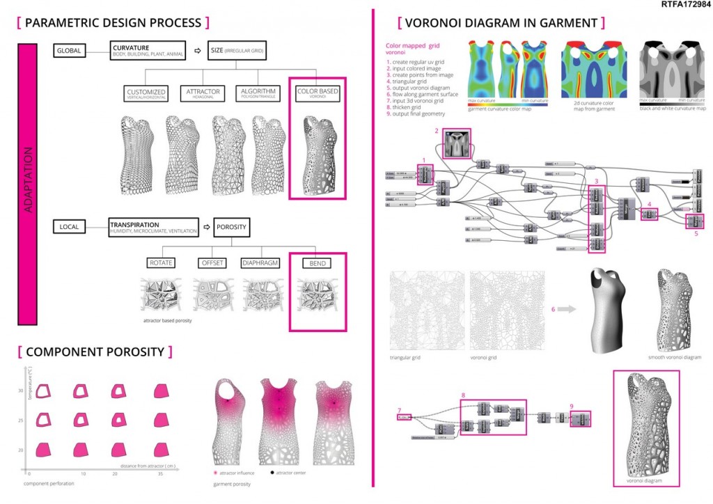 The design intends to answer multiple questions. The main design axes are related to curvature, adaptivity and thermal comfort. The size and shape of components that makes up the surface is the first design parameter, affected by the curvature of the body and acts globally like scales. The second design parameter acts locally, so each component has the ability to open and close, influenced by environmental conditions (humidity and temperature). The place of the opening and closing components depends on the sweating body parts and the rhythm that the sweat is producing in each part. In this way we define areas where the garment needs more punching to achieve natural ventilation that leads to cooling and thus to thermal comfort. Three-dimensional illustrations of the garment are represented with closed and opened components, so you can see how it is shifting to different temperatures.