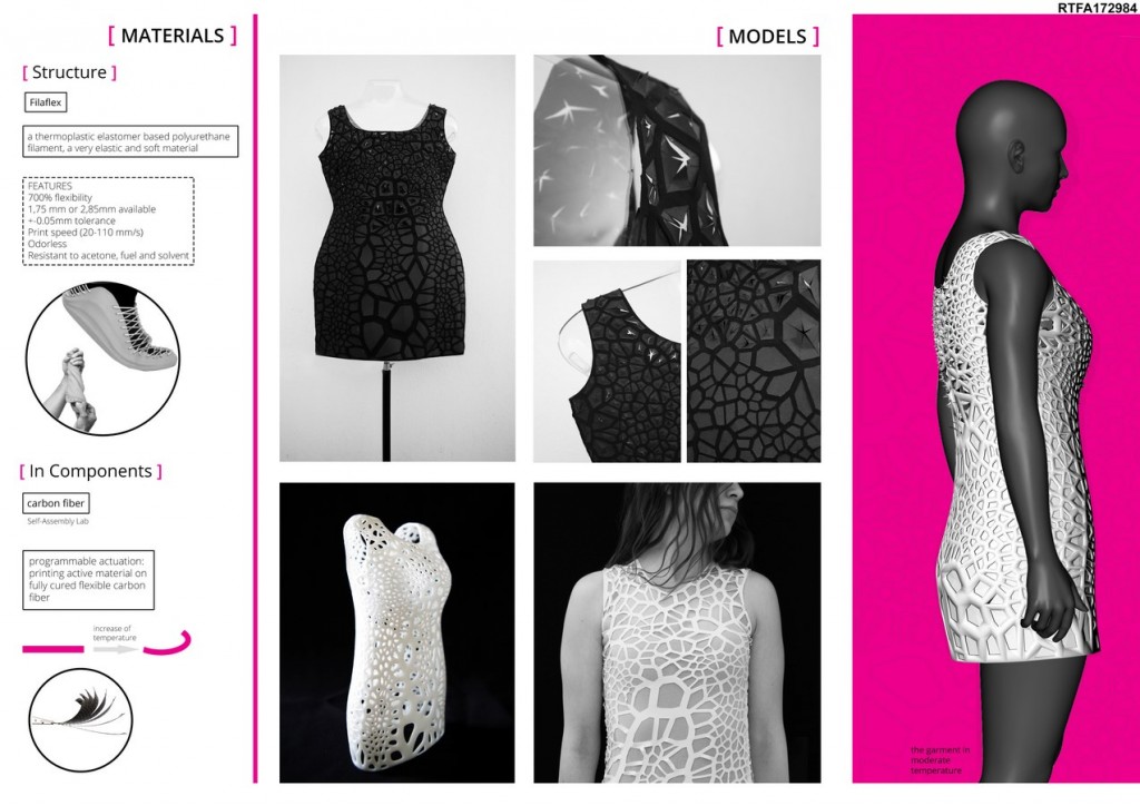This garment is to be printed in multi material 3D printer. The entire surface will be composed of flexible material, for example filaflex which is a thermoplastic elastomer based polyurethane filament. This is a 700% flexible, soft material. The same printer, with different material deposition head, will incorporate at the same time smart material in components, giving them the ability to move triggered by the environment temperature. It could be self-transforming carbon fibber programmed to transform autonomously by heat as an activator (Self-Assembly Lab, Autodesk Inc, International Design Center, MIT). As a result components open and close contributing to the cooling of the body.