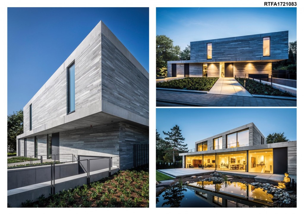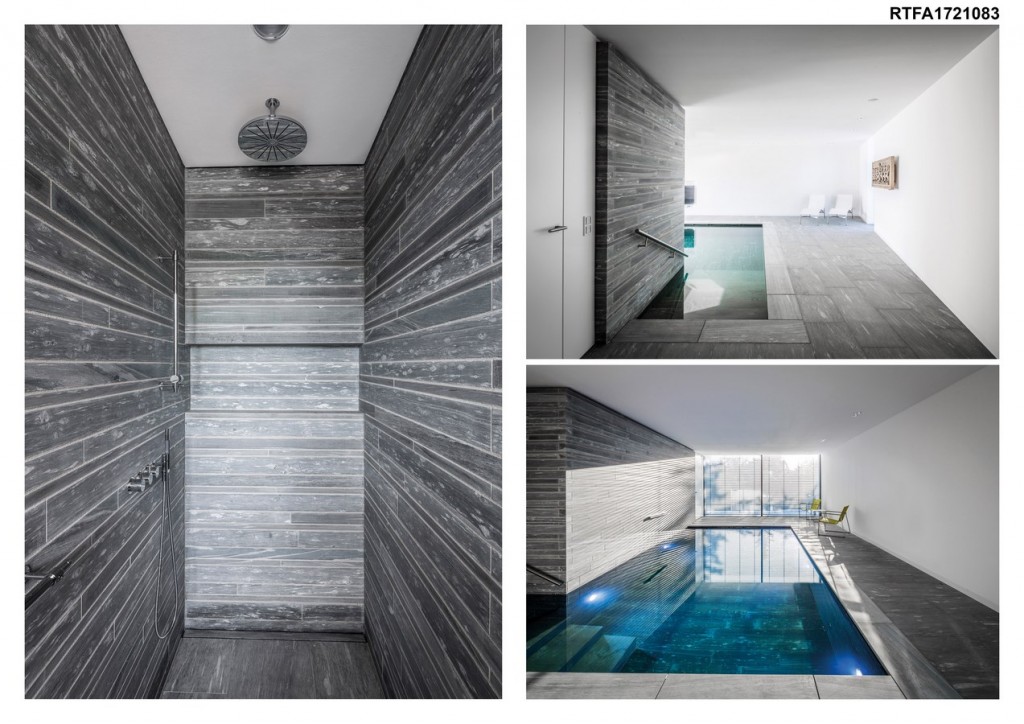 The design goal with regard to materials was to create a uniform look for the interiors and exteriors: pool, floor surfaces, select walls in spa and bath and the facade would be clad in the same material. A matte gray quartzite from Vals, Switzerland was chosen, which harmonizes tactually well with the home’s water elements and embodies the strength that naturally radiates from the building. These longitudinal stone strips, each measuring up to 150cm in length, emphasize the building’s horizontal alignment and narrows the appearance of each story. The effect is furthered by the large format concrete panels, which accentuate the division of floors, resulting in a slim, elegant and distinctive look.