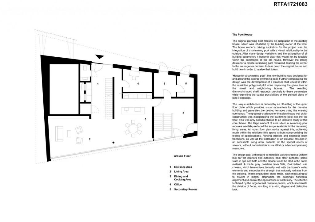 ‘House for a swimming pool’: the new building was designed for and around the desired swimming pool. Further complicating the design was the development of a structure that would fit within the restrictive polygonal plot while respecting the given lines of the street and neighboring homes. The resulting diamond-shaped shell responds precisely to these parameters while exploiting the spatial possibilities of the pointed piece of land it occupies.