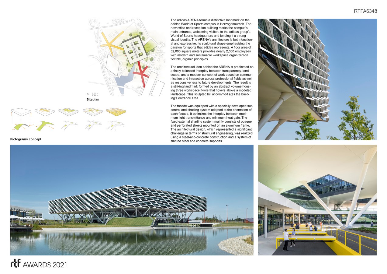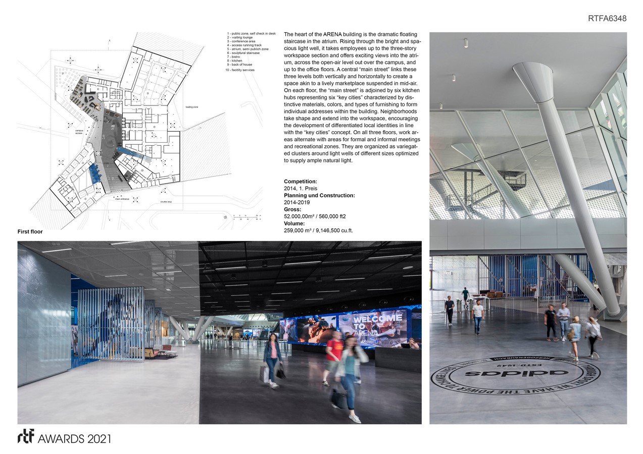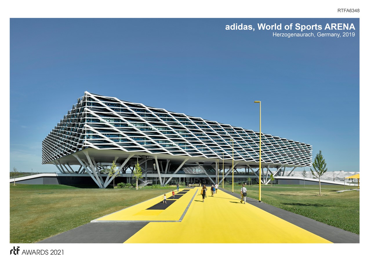 The adidas ARENA forms a distinctive landmark on the adidas World of Sports campus in Herzogenaurach. The new office and reception building marks the campus’s main entrance, welcoming visitors to the adidas group’s World of Sports headquarters and lending it a strong visual identity. The ARENA’s architecture is both functional and expressive, its sculptural shape emphasizing the passion for sports that adidas represents. A floor area of 52,000 square meters provides nearly 2,000 employees with modern and sustainable workspace organized on flexible, organic principles.