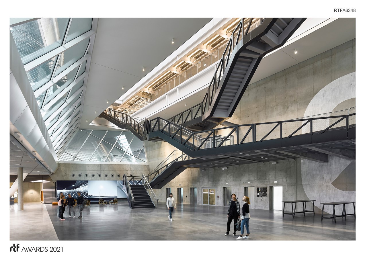 The facade was equipped with a specially developed sun control and shading system adapted to the orientation of each facade. It optimizes the interplay between maximum light transmittance, including in winter, and minimum heat gain. The fixed external shading system mainly consists of opaque and perforated sheets mounted on an aluminum frame. Thanks to its implementation of up-to-date energy-efficiency standards and extensive use of recyclable materials, the building has been submitted for LEED Gold certification. The architectural design, which represented a significant challenge in terms of structural engineering, was realized using a steel-and-concrete construction and a system of slanted steel and concrete supports. For its achievements in structural engineering, the ARENA building was honored with the Engineering Award of the German steel construction industry association bauforumstahl e. V. early in 2019.