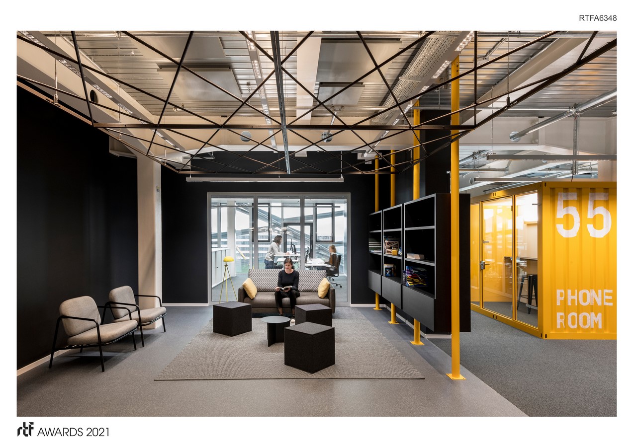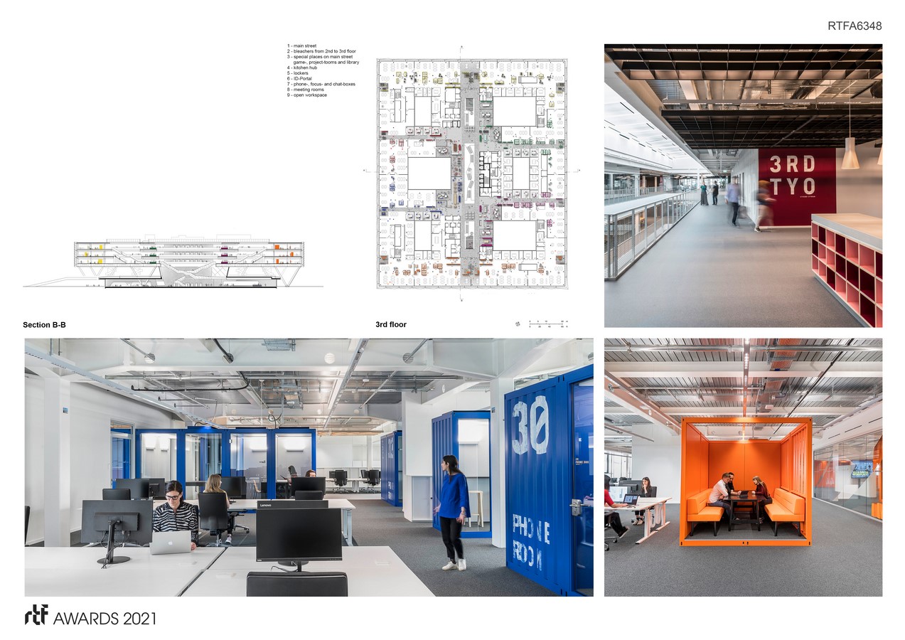 The heart of the ARENA building is the dramatic floating staircase in the atrium. Rising through the bright and spacious light well, it takes employees up to the three-story workspace section and offers exciting views into the atrium, across the open-air level out over the campus, and up to the office floors. A central “main street” links these three levels both vertically and horizontally to create a space akin to a lively marketplace suspended in mid-air. On each floor, the “main street” is adjoined by six kitchen hubs representing six “key cities” characterized by distinctive materials, colors, and types of furnishing to form individual addresses within the building. Neighborhoods take shape and extend into the workspace, encouraging the development of differentiated local identities in line with the “key cities” concept. On all three floors, work areas alternate with areas for formal and informal meetings and recreational zones. They are organized as variegated clusters around light wells of different sizes optimized to supply ample natural light.
