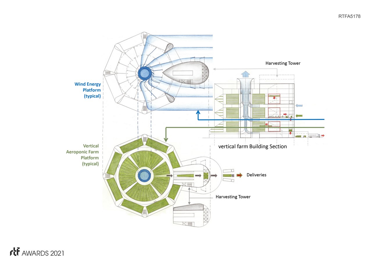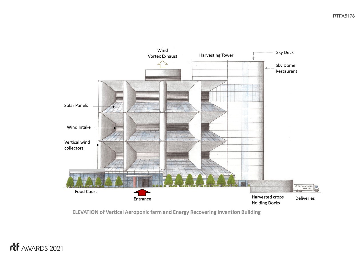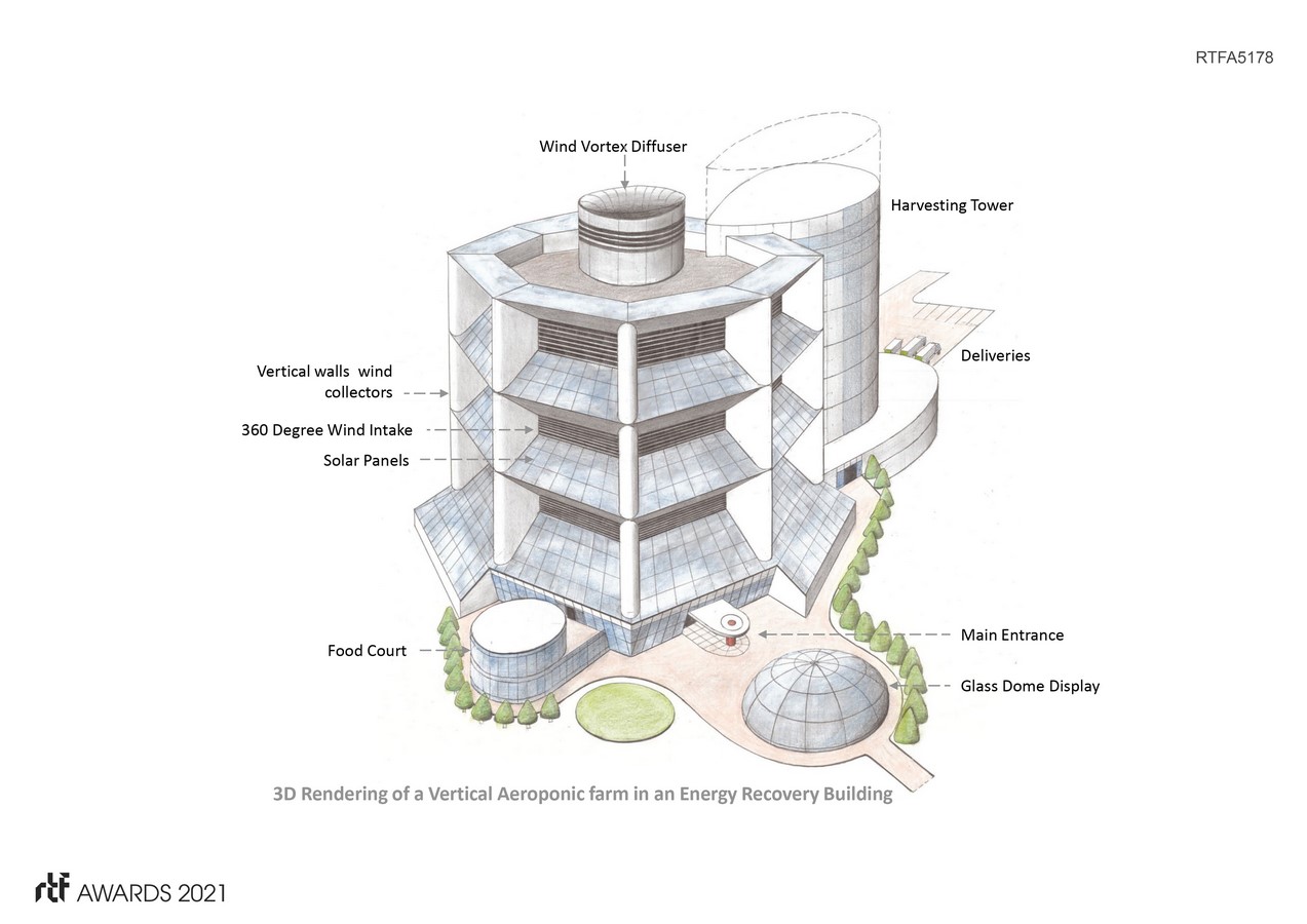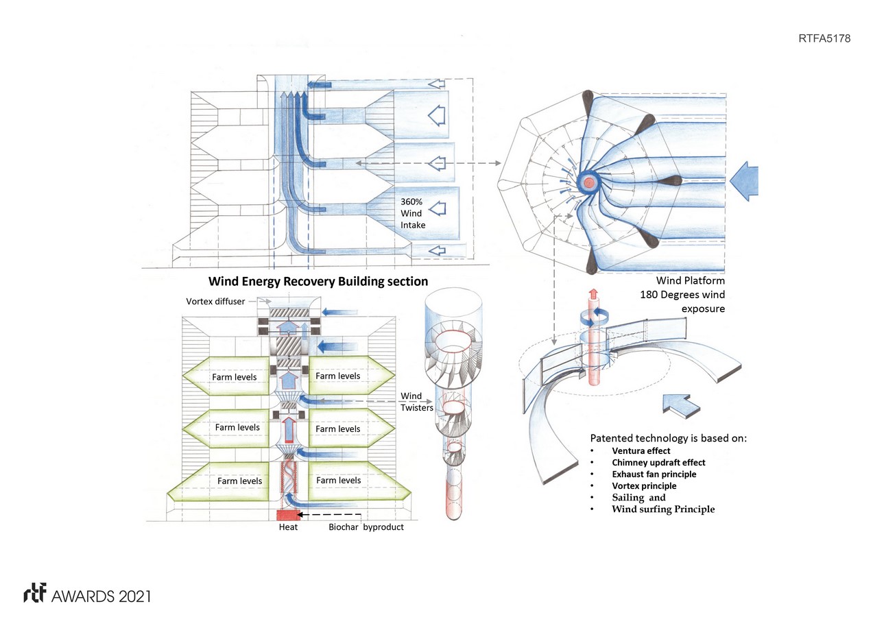 A 16 story CIVAR patented energy recovery building, emitting zero CO2 emissions uses Solar, Wind, Geothermal, as well as Incineration heat as its energy source. Its patented technology is based on: Ventura effect, Chimney updraft effect, Exhaust fan principle, Vortex principle and Sailing principles. This building can generate approx. 3.5 to 4.5 Megawatts of energy to run the farm and other multi occupancies within the building.