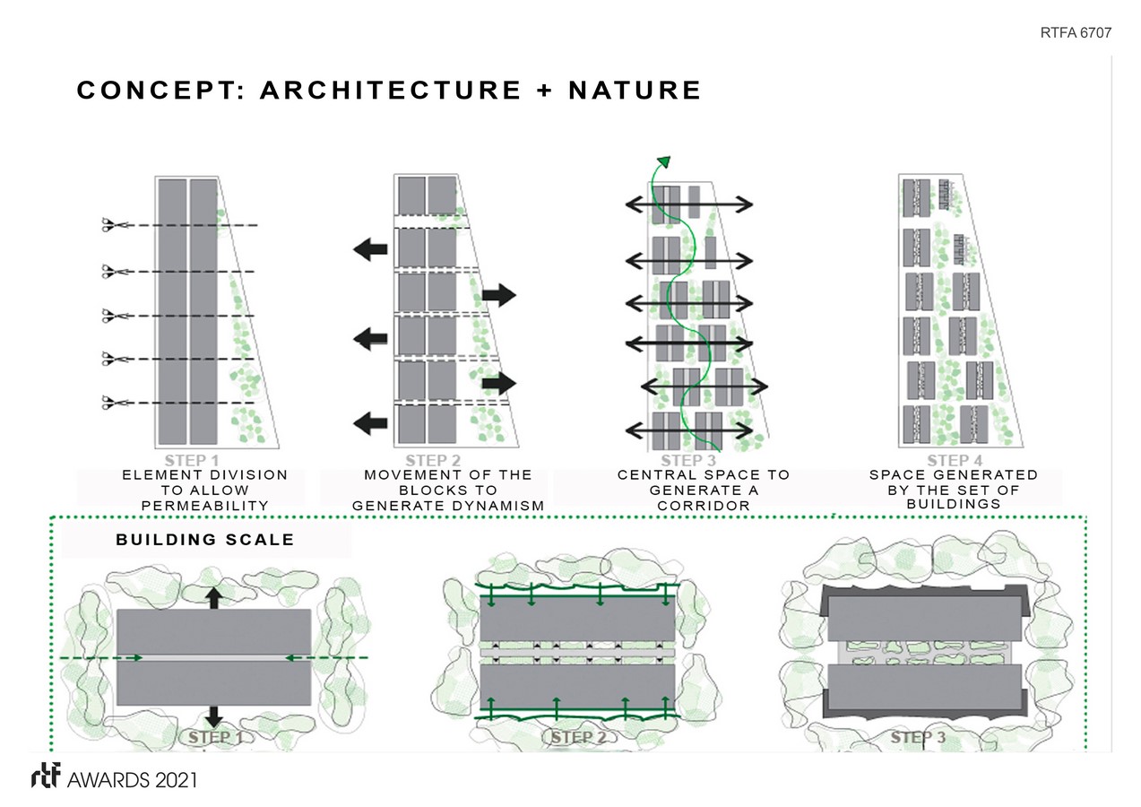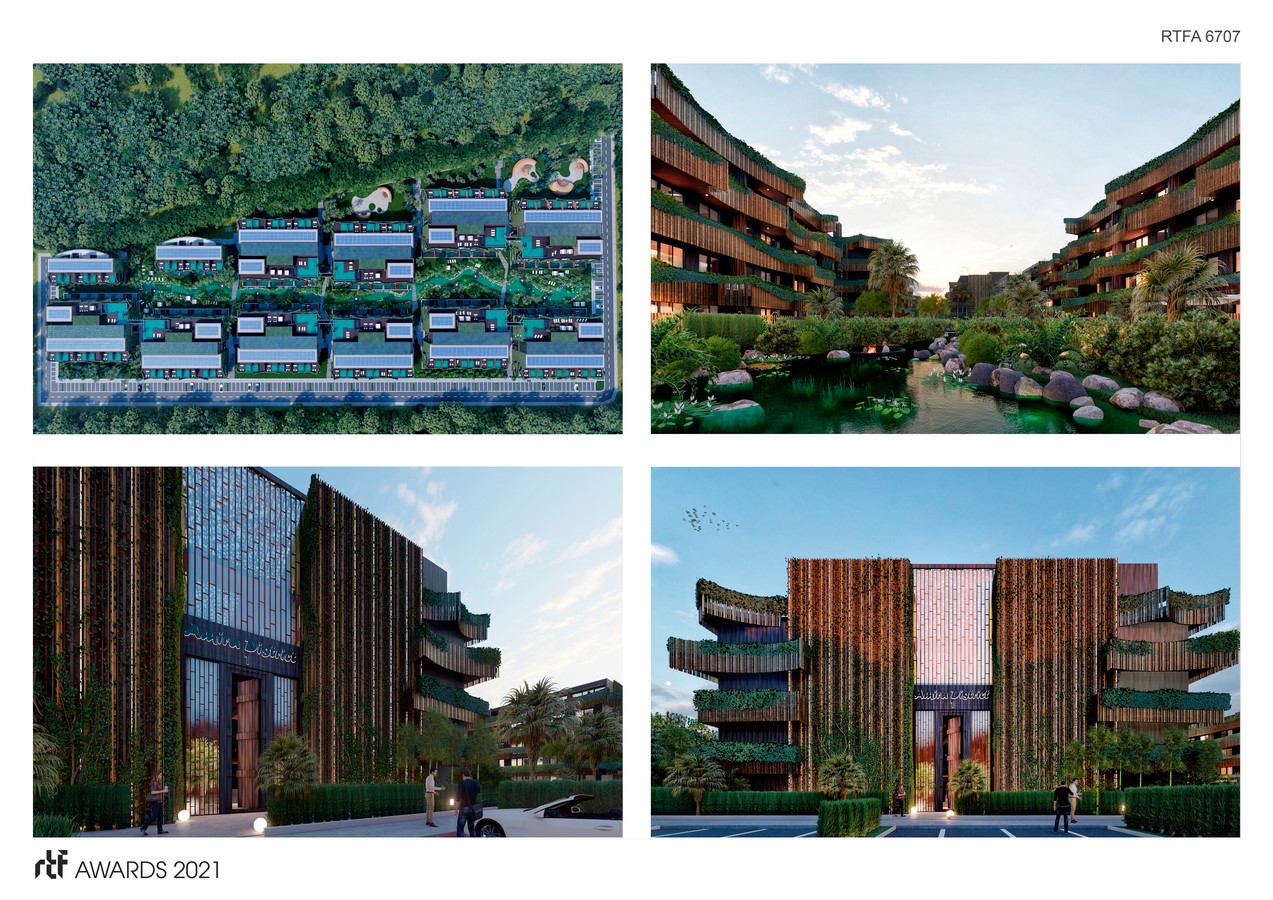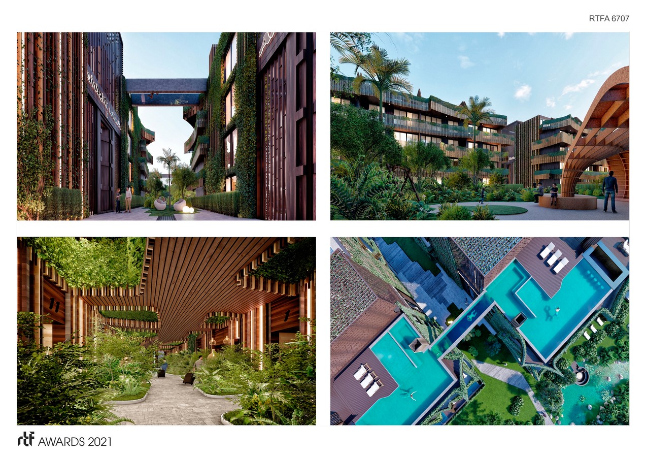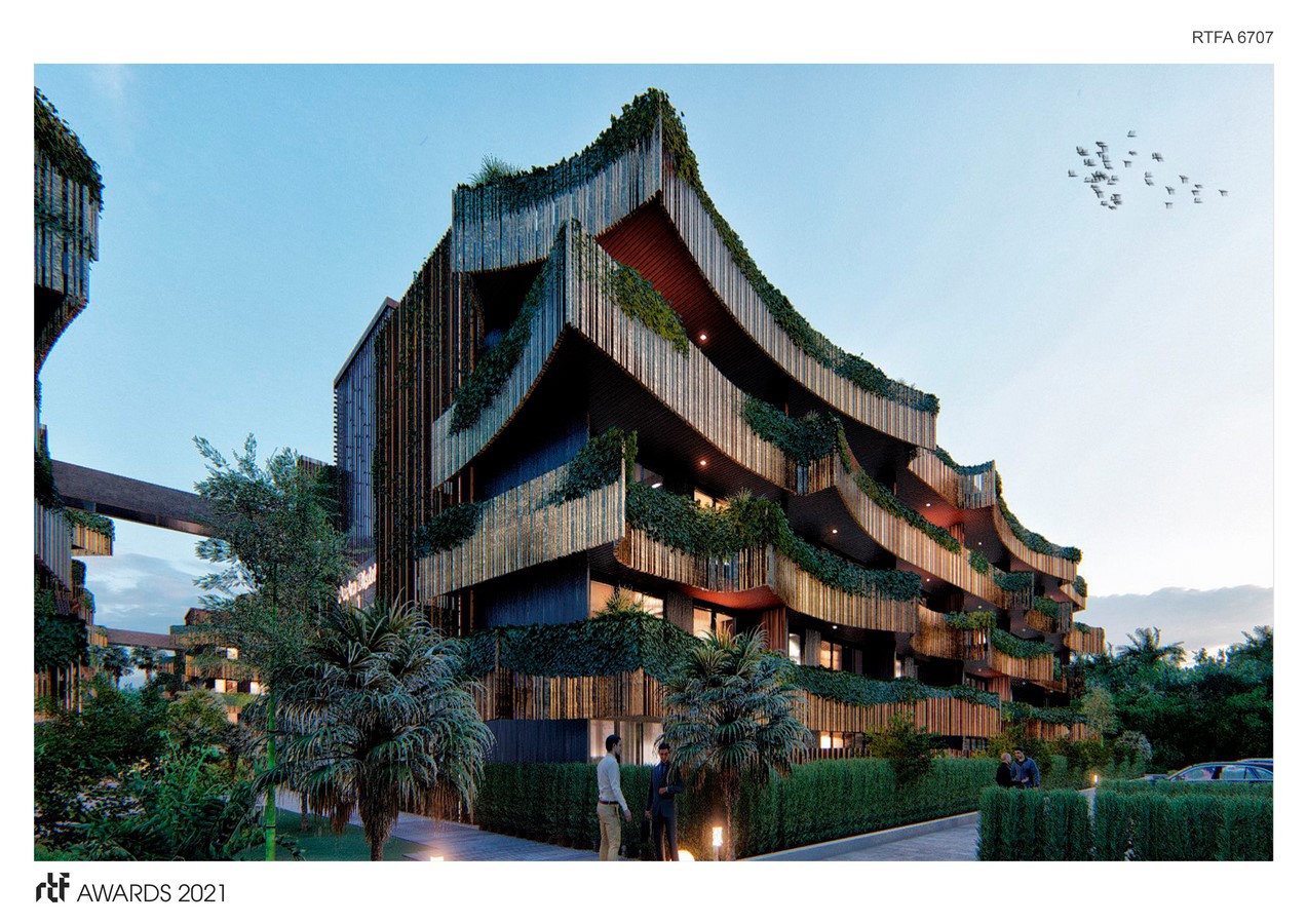 “Amira District” bases its design on the communion between the natural environment and a contrasting geometry with it. The facade emulates the movement of the waves creating dynamism and the material of the facade is indigenous bamboo. The architecture merges with the Nature entering inside the building and going up to the roof top where the social life of each community is flourishes with its unique experiences such as spa, gym, and “bridge pools”.