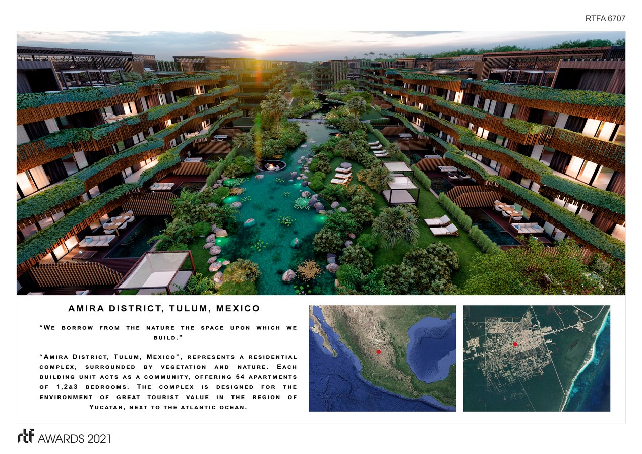 “Amira District, Tulum, Mexico”, represents a Residential Complex, mostly surrounded by vegetation and nature which provide with unique sensations throughout different available experiences. Each Building Unit will act as a community with 54 apartments of 1&2&3 bedrooms. The project is designed for the environment of great tourist and scenic value in a natural location in the Yucatan region next to the Atlantic Ocean.