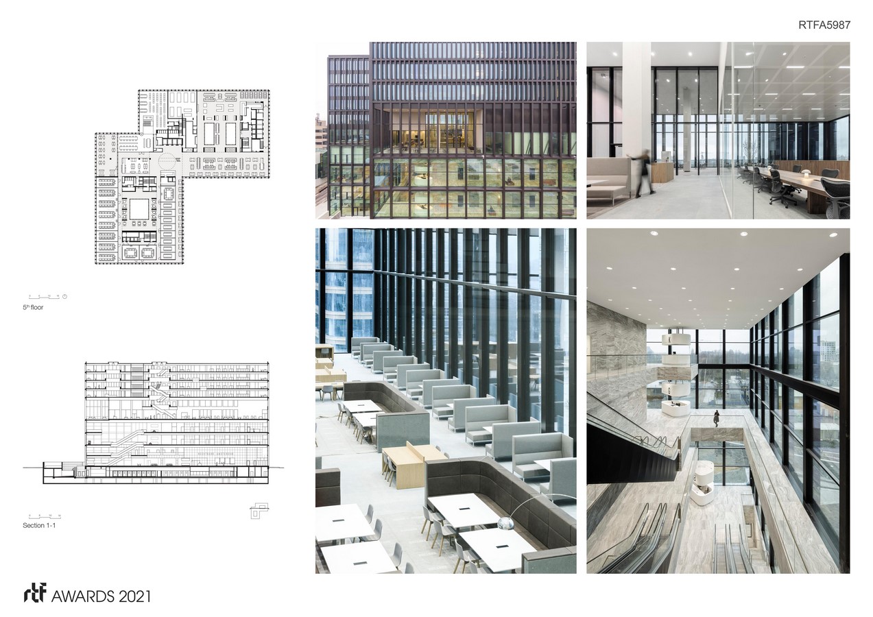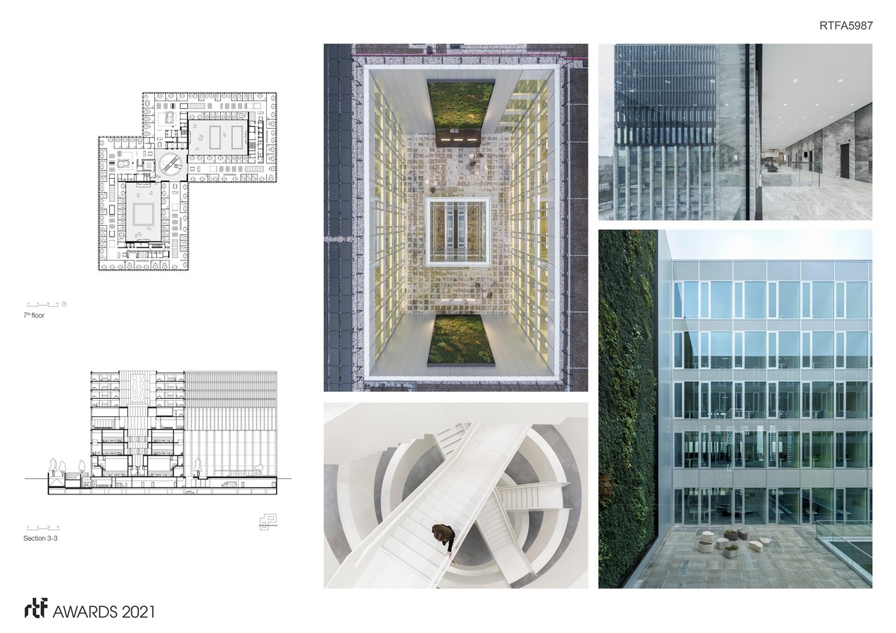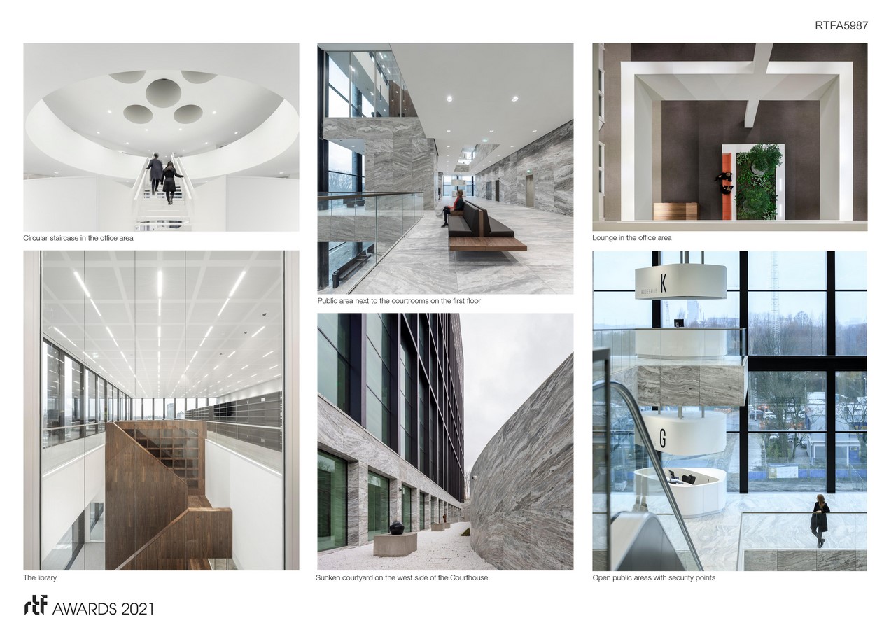 In its design, the Courthouse adheres to the principle that the judicial process is a public matter. Exuding approachable authority, the 50-meter-high building is a stately yet inviting institution for public discourse. A vast square in front of the building offers an unobstructed view to the lower floor dedicated to the public area, through large windows. Passing an elegant canopy on the main square, visitors are welcomed into the ground floor central foyer, equipped with reception desks and a cafeteria. Rising upward, the courtrooms unfold surrounded by spacious foyers where visitors come and go, lawyers consult with clients and reporters. Highest floors are connected through a grand circular staircase, giving way to offices and judges’ chambers set around green indoor and outdoor courtyards. Meanwhile, the detention cell area for the defendants is located under the building with separate pick-up and drop-off ramps.