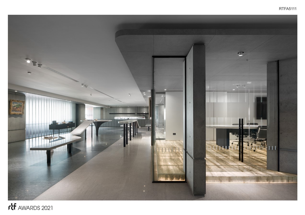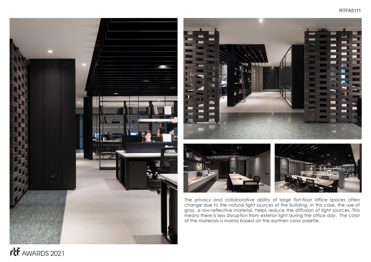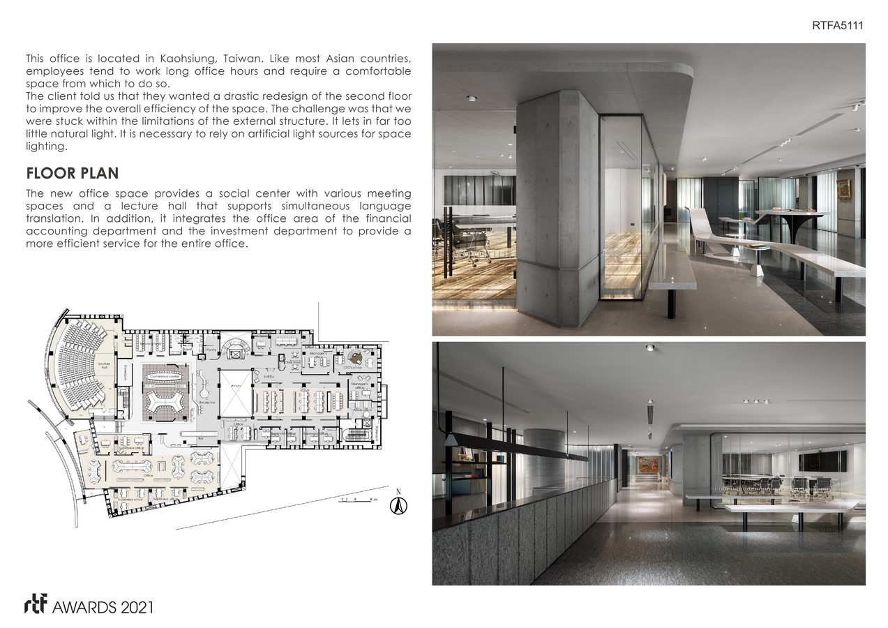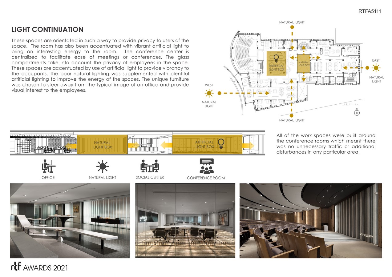 The new office space provides a social center with various meeting spaces and a lecture hall that supports simultaneous language translation. In addition, it integrates the office area of the financial accounting department and the investment department to provide a more efficient service for the entire office. All of the work spaces were built around the conference rooms which meant there was no unnecessary traffic or additionally disturbances in any particular area. The glass compartments take into account the privacy of employees in the space. These spaces are accentuated by use of artificial light to provide vibrancy to the occupants.