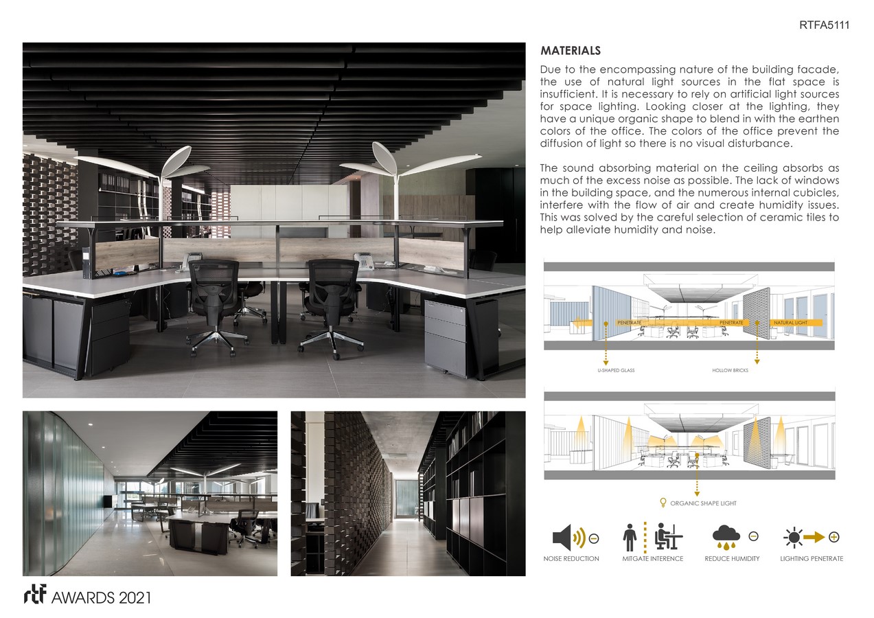 The poor natural lighting was supplemented with plentiful artificial lighting to improve the energy of the spaces. The unique furniture was chosen to steer away from the typical image of an office and provide visual interest to the employees. The sound absorbing material on the ceiling absorbs as much of the excess noise as possible. The lack of windows in the building space, and the numerous internal cubicles, interfere with the flow of air and create humidity issues. This was solved by the careful selection of ceramic tiles to help alleviate humidity and noise. Looking closer at the lighting, they have a unique organic shape to blend in with the earthen colors of the office. The colors of the office prevent the diffusion of light so there is no visual disturbance.