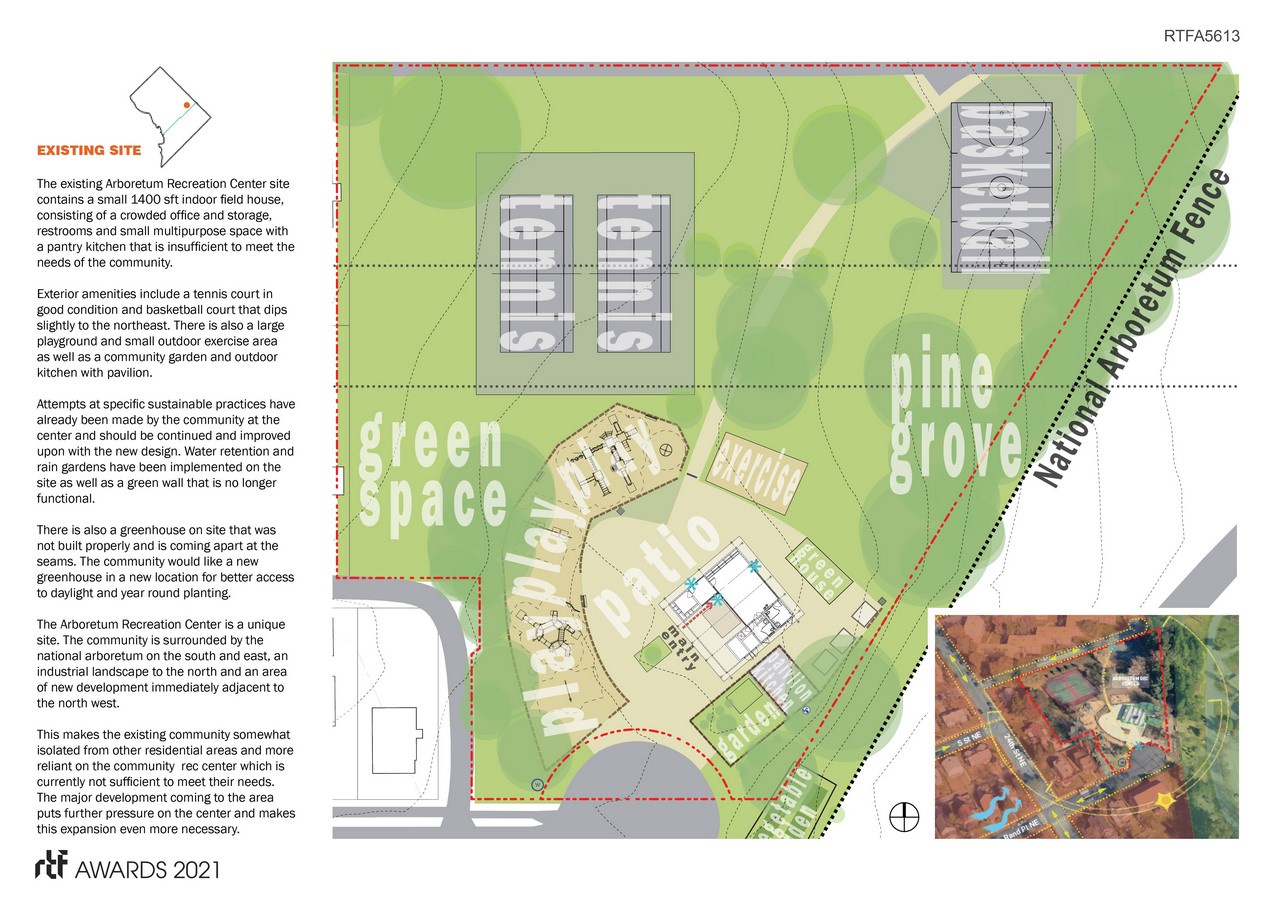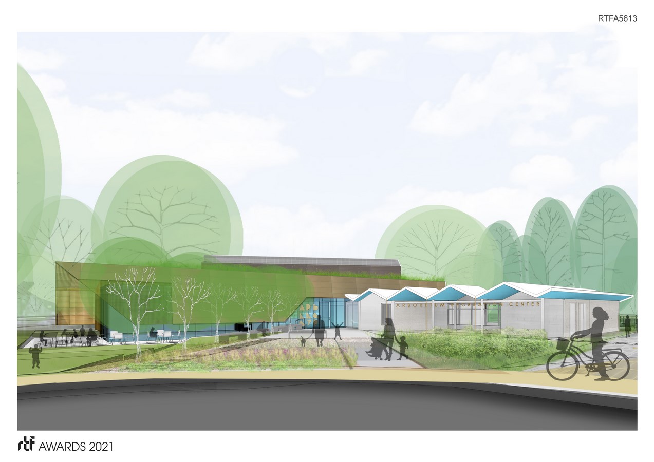 By creating a building that plays with level changes and materiality we can enhance flexibility of space and find a harmony between the mid-century modern Field House and the New Addition. A homage to the adjacent Arboretum can also be found in the decision to create a flow between exterior and interior throughout the project and the metal screen brings a modern take to an existing formula. The design for the Arboretum Recreation Center fuses form, function, and sustainability.
