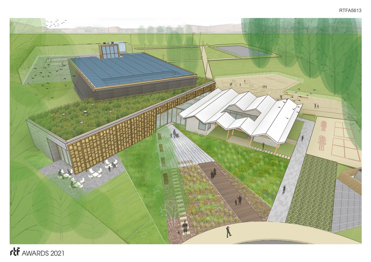 A glass connector piece abuts the exiting Field House allowing a daylit lobby and a subtle touch on the historic building while also blurring the lines between interior and exterior. A metal screening element brings a sculptural touch to the project in addition to shading the community room and framing the entrance to the center. The partially sunken community room allows for access to an ample patio, continuing the physical and visual access to exterior spaces as a theme throughout the building. This partially sunken space also allows for a high ceiling which adds to the versatility and flexibility of the room as requested by the community. The Gym being recessed 7′ below grade allows us to expand to an exterior amphitheater and maintaining a connection to the exterior landscape while also creating the height needed for a solar chimney and not towering over the existing historic building. This gym is constructed of CLT, a sustainable wood construction method, adding to the green nature of the building while also bringing warmth to an otherwise often stark typology. Other features such as the green roof and Solar panel array as well as rainwater retention add to the building’s sustainability.