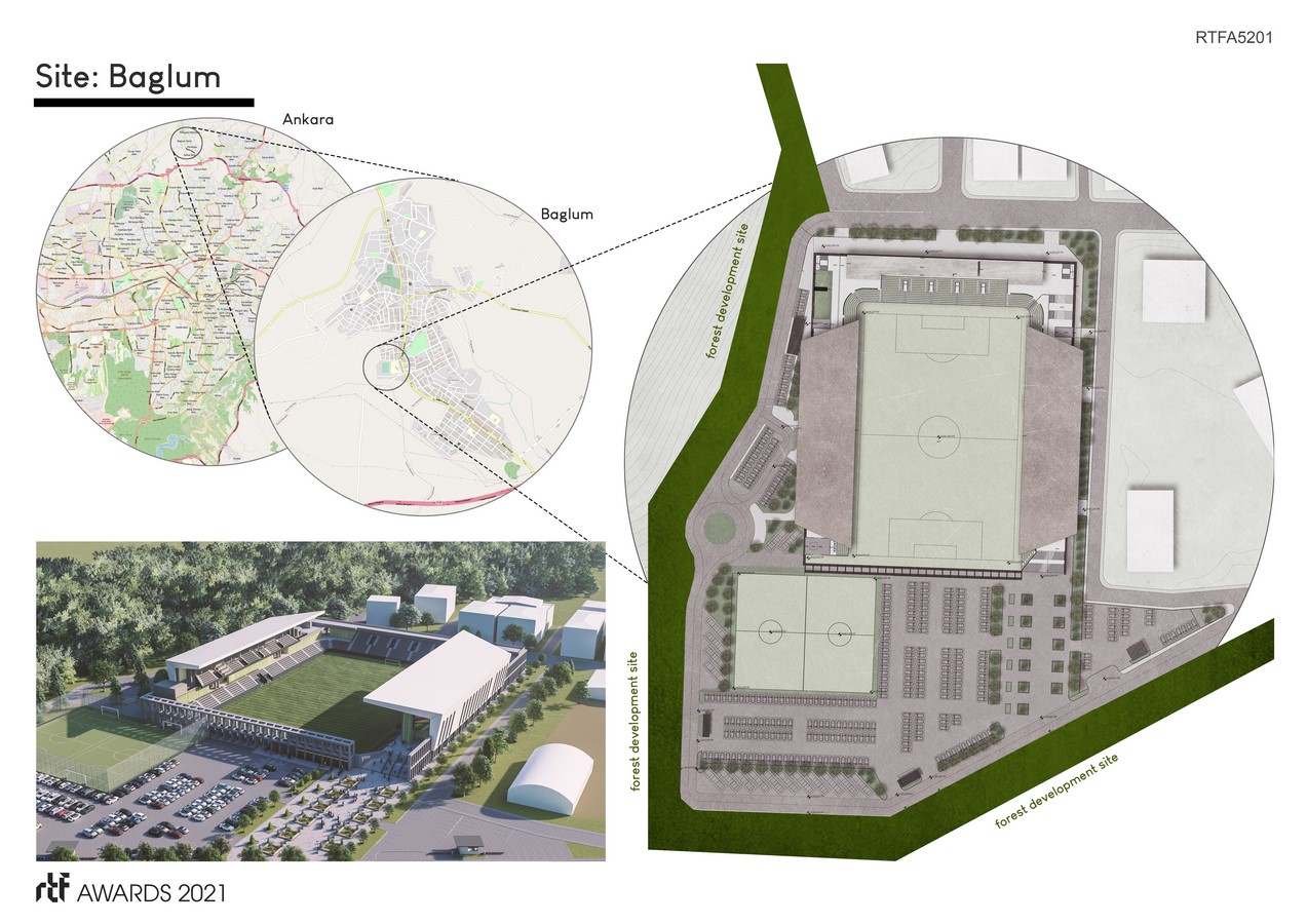 Baglum Culture and Sports Complex is designed to serve as a cultural hub combining a range of public functions for the community of Baglum. The structure will be located on the site of the derelict stadium of the local football team. As the local community has access to a very limited budget, it is essential to utilize potentials to their fullest as possible. After analyses of the existing and potential problems experienced by the local community, two main problems surfaced that helped shape the proposal for the new sports complex: