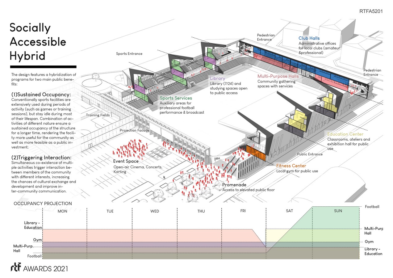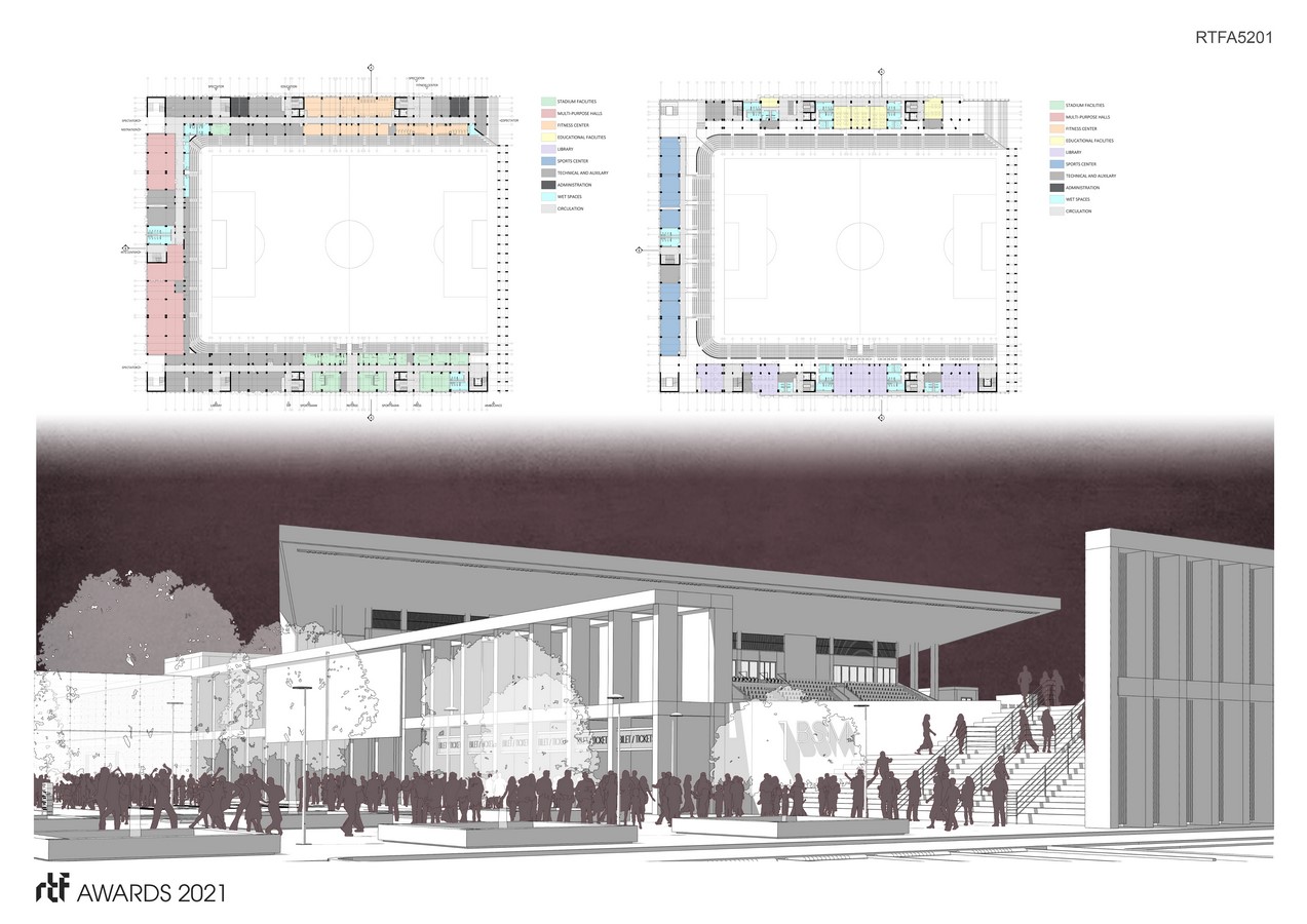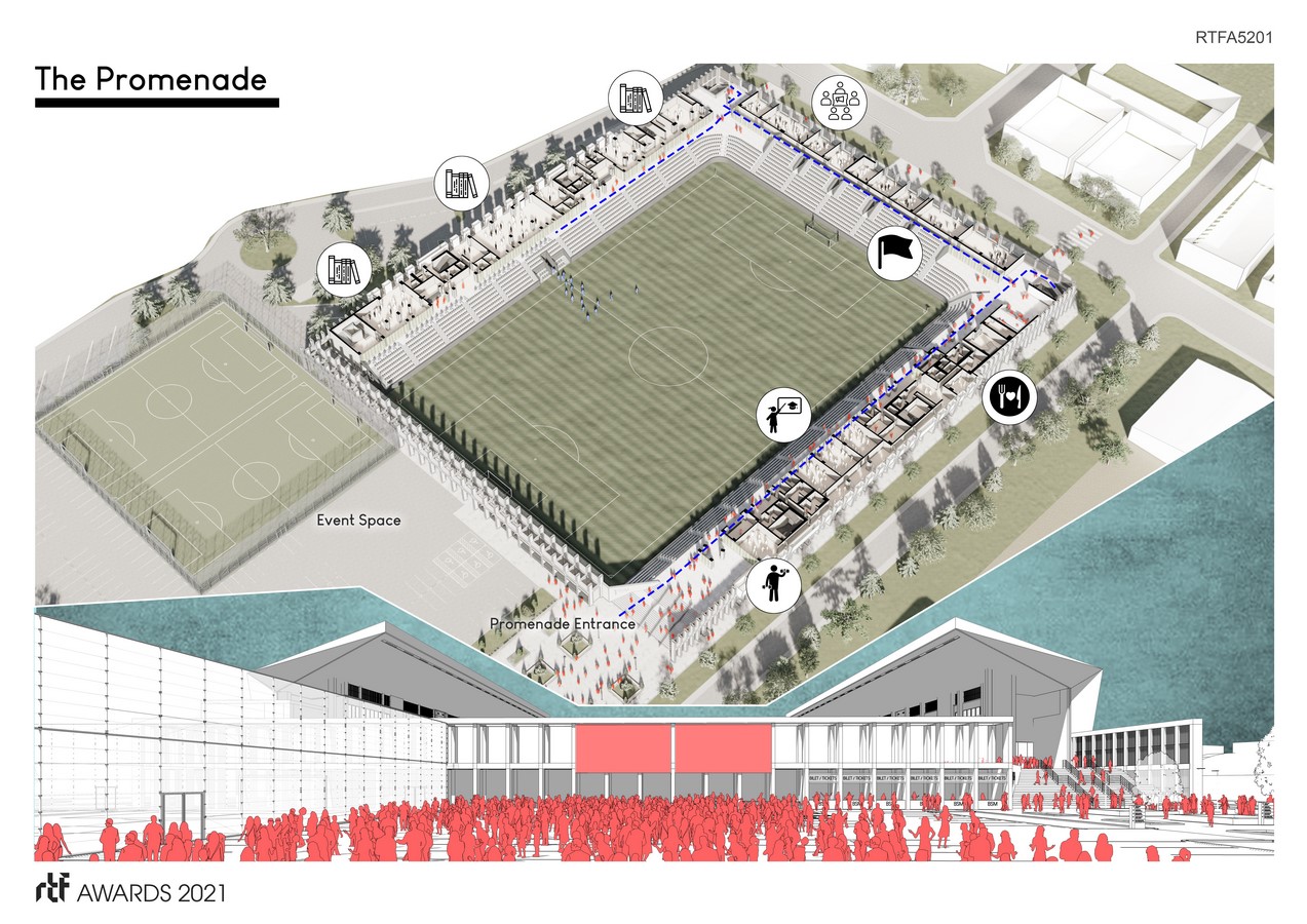 The hybridization of sports facilities with social and cultural functions requires a certain complexity in the organization of functions. Both social and sports functions are required to operate independently while maintaining dialogue, resulting in a multi-layered section. The first level separating the upper and lower seating blocks function as a socially accessible cultural promenade that houses various public functions. The promenade connects with the urban fabric on the north and with an new event space on the south.