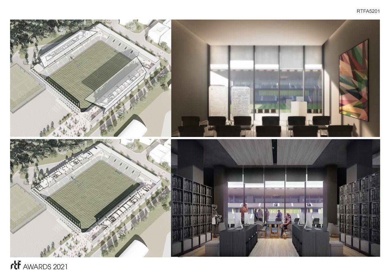 Upon defining the problem more clearly, it was decided that the structure should serve the residents beyond providing a proper football pitch, but also undertake some of the social and cultural amenities currently lacking in the district. The resulting design proposal features a โlivingโ structure that operates as a city hall accessible to all people of the city, while still serving the professional football team with respect to all of itsโ spatial requirements.