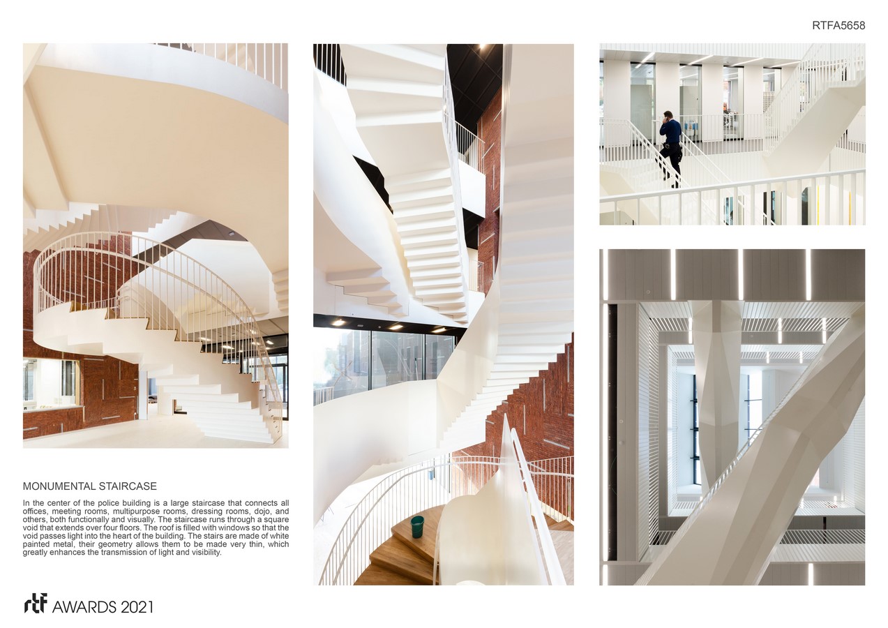 The building is simple and well-ordered. The “mega-brick” cladding responds to the local context – a traditional building material applied in a non-traditional way. Regularly spaced, vertical windows fit into the mega brick system allowing predictable light to enter the flexible internal office layouts. Stretched metal (“mesh-wall”) clad void spaces between each volume, and contrast the rational brick façade. These voids define courtyards, bring daylight deep into each floor plan, modulate solar energy gain, as well as create functional outdoor spaces. Transparent connectors between the main volumes contain all the vertical circulation and common meeting areas.