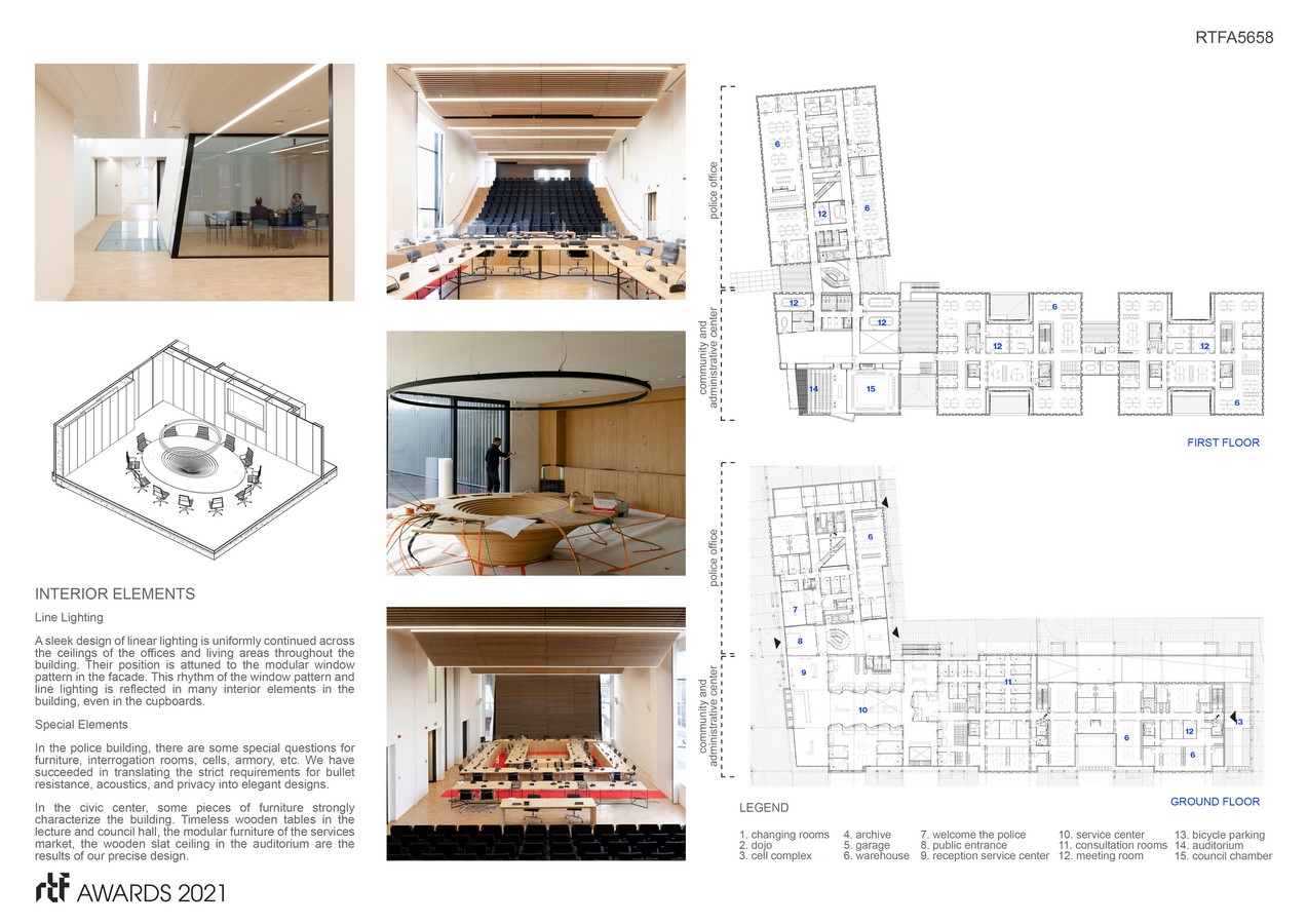 The Beveren Civic Center is located on the central artery in the heart of the City of Beveren, twenty minutes west of Antwerp. The project is the new central municipal administration building containing all city hall departments, public service administration, and the police headquarters. The police station and city hall departments are each housed on one leg of an L-shaped building. At the junction of both is an entry volume, which contains the representative functions of the civic center: assembly hall, public auditorium, and public “service market”. The entry façade opens onto and helps define a new civic square.