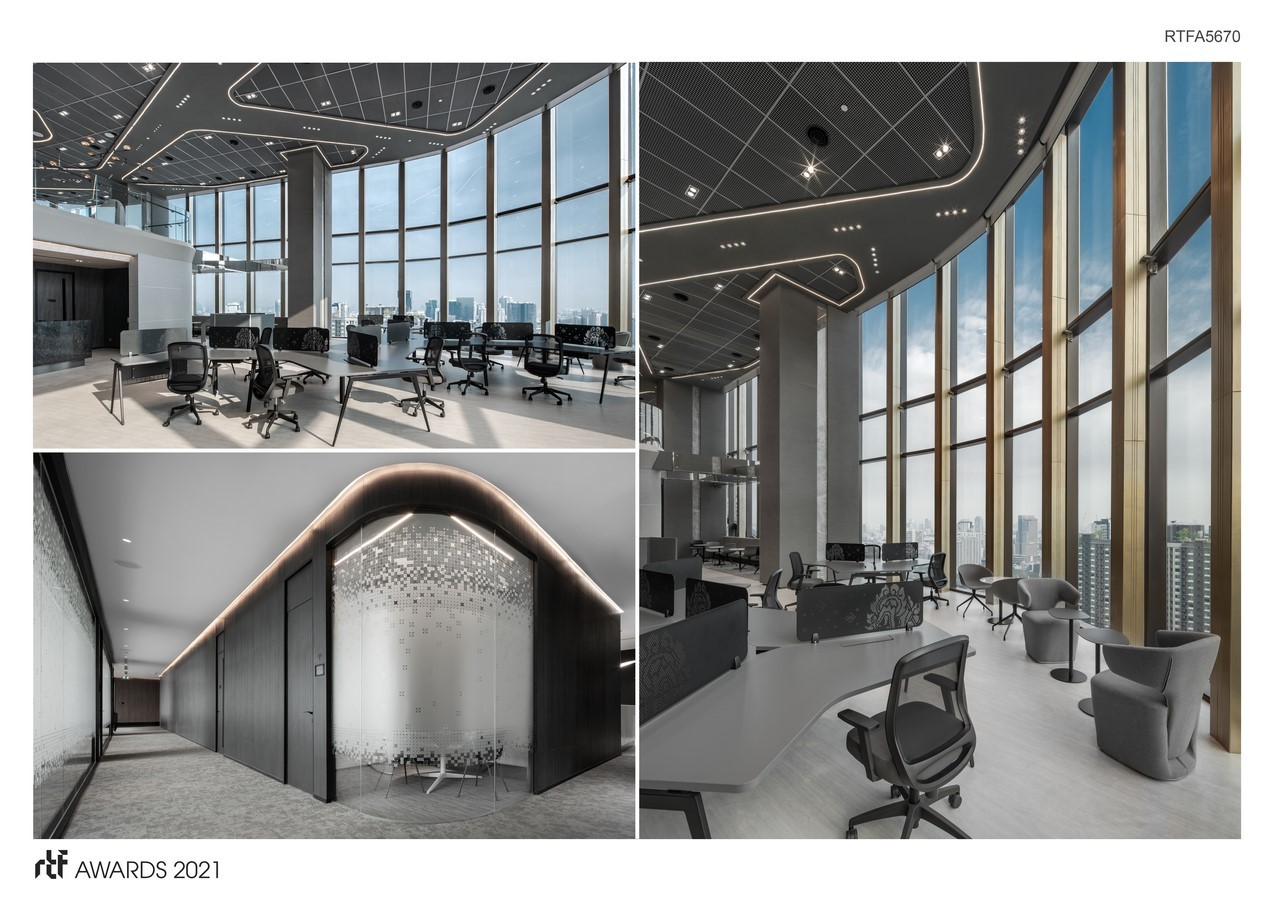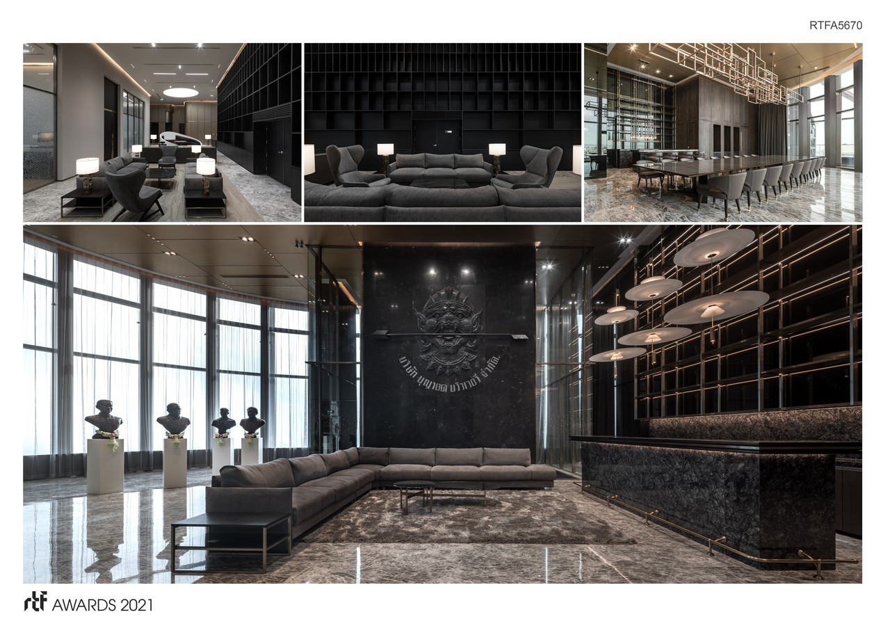 “Where Legend Meets Innovation” is the phrase describing a main design concept of the Boon Rawd Brewery Headquarters. The design concept is derived from the business characteristic itself. Starting from operation water buses and later turned into manufacturing beer, the company has a deep connection with “water”. The flow of the water is then adapted into the flow of space, combined with Thai rustic decoration style. Golden bubbles colour, gray and black are employed to create a formal and dignified personality.