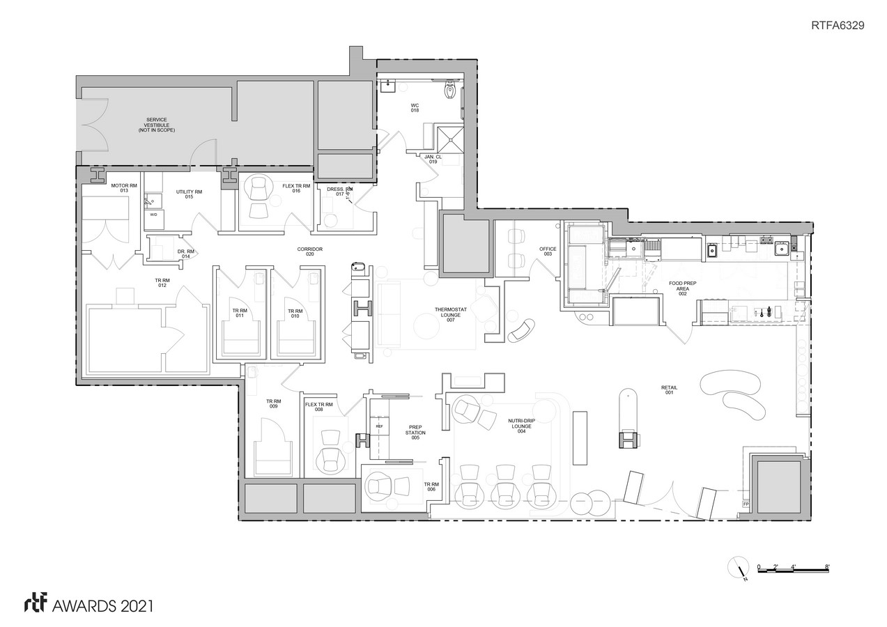 Next to the wood ceiling that defines the Nutridrip Lounge is a bluestone volume which announces the Thermostat brand. Through its threshold, two neon signs boldly present its offer to “sweat” or “chill.” The Thermostat lounge allows a quick respite in between, should you choose to take advantage of both the full-body cryotherapy chamber and one of several private infrared sauna rooms.