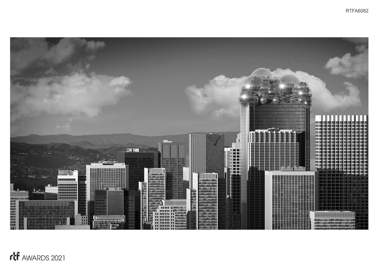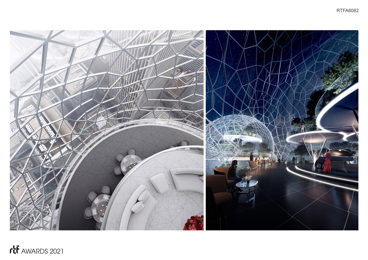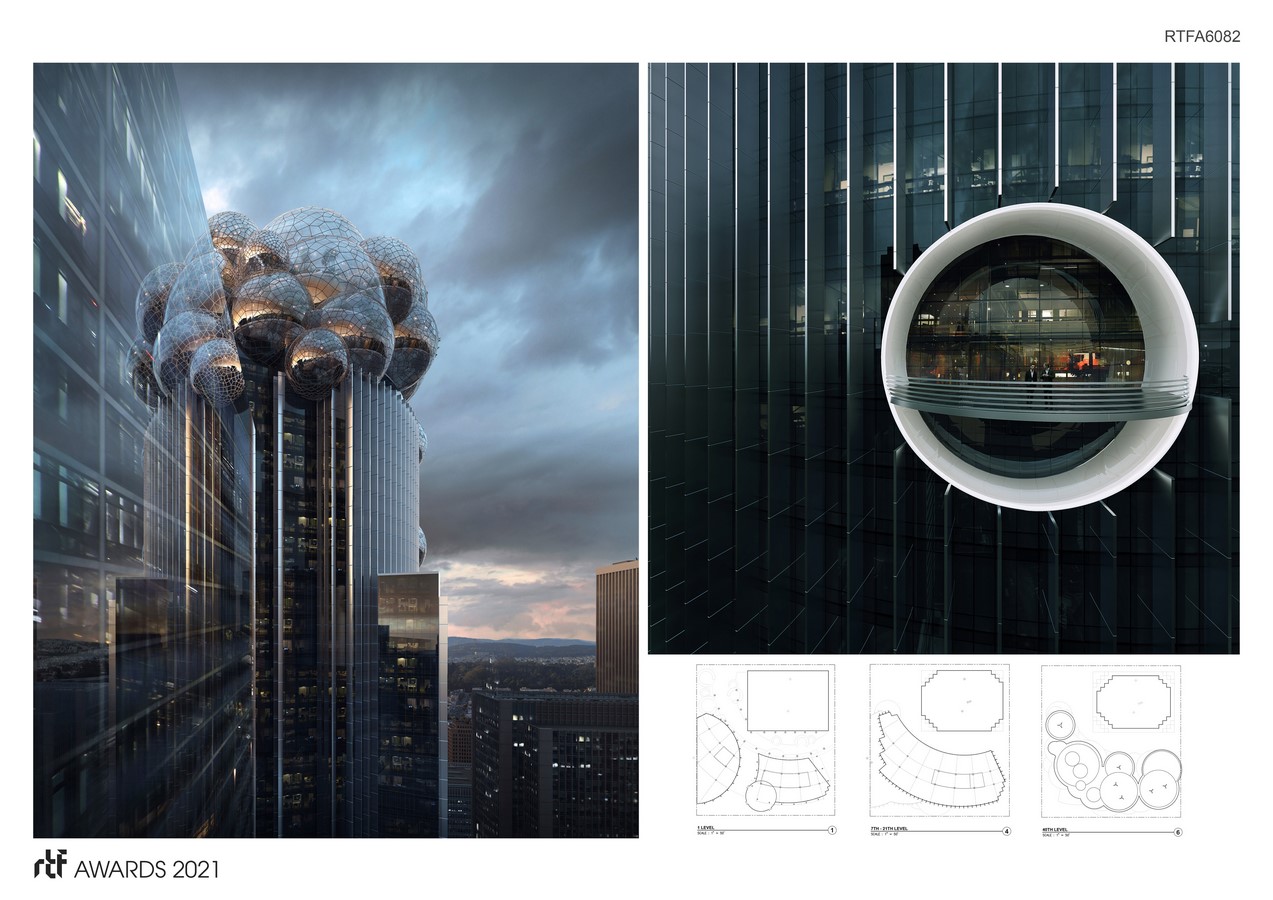 On an urban scale, the emotional intent for the building’s crown is expressed by a mysterious and tumultuous form, part technological wonder, part natural allusion. The top eight stories are ethereal, like a vapor. A harmonic arrangement of thirty glass spheres, of varying diameters, form the basis for this metaphor. Within this composition of soaring bubbles are vast sky gardens, public and private spaces, including cafes, exhibition rooms, and meeting and work areas.