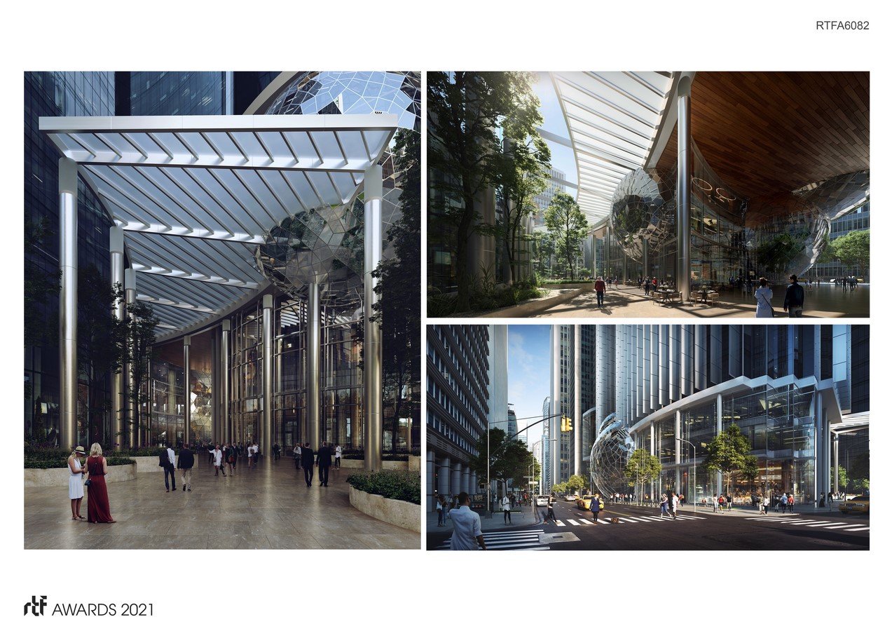 The design for this 1,300,000 square-foot building follows a classic base, middle, and top parti. The base is a study in humane scale. The long western street frontage is bisected by a forty-foot wide passage thru the building and is paired with an iconic lobby taking the form of a sixty-foot sphere emerging from the ground and making its way towards the sky. We celebrate the space between this project and its neighbor with a broad paseo that follows a grand arc, connecting a new south mid-block alley to an eastern midblock alley. This network of spaces is activated by incorporating indoor and outdoor retail, pedestrian-oriented service, and dining spaces into the public realm.