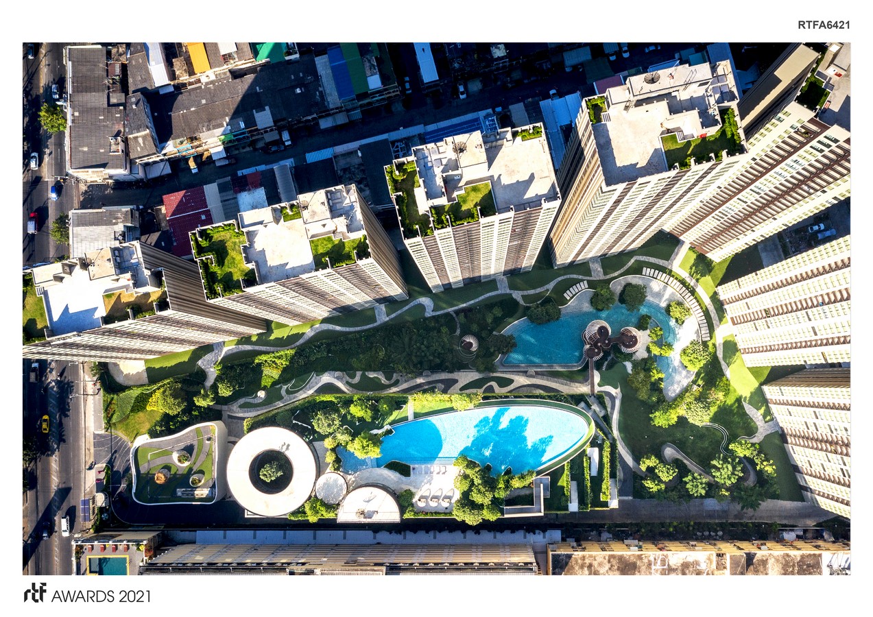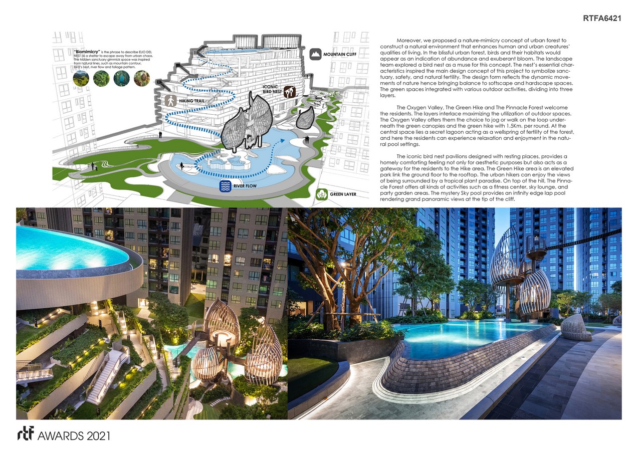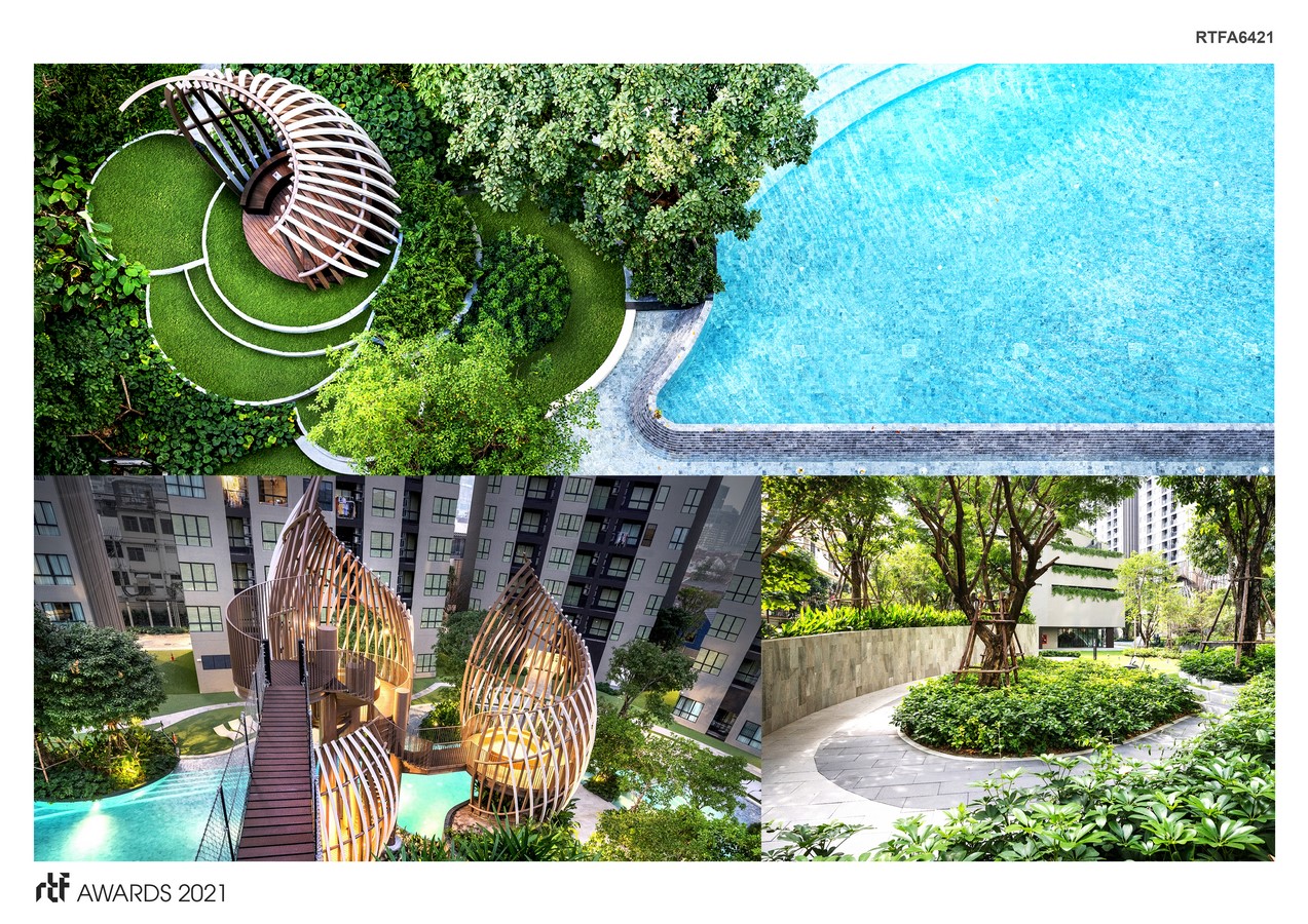 Moreover, we proposed a nature-mimicry concept of urban forest to construct a natural environment that enhances human and urban creatures’ qualities of living. In the blissful urban forest, birds and their habitats would appear as an indication of abundance and exuberant bloom. The landscape team explored a bird nest as a muse for this concept. The nest’s essential characteristics inspired the main design concept of this project to symbolize sanctuary, safety, and natural fertility. The design form reflects the dynamic movements of nature hence bringing balance to softscape and hardscape spaces. The green spaces integrated with various outdoor activities, dividing into three layers, The Oxygen Valley, The Green Hike and The Pinnacle Forest welcome the residents. The layers interlace maximizing the utilization of outdoor spaces. The Oxygen Valley offers them the choice to jog or walk on the loop underneath the green canopies and the green hike with 1.5Km. per round.