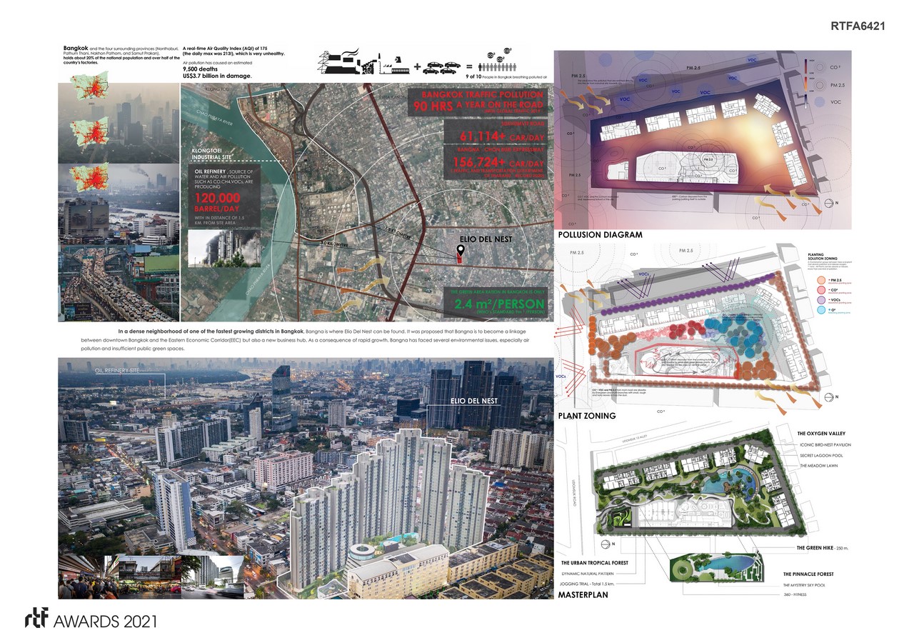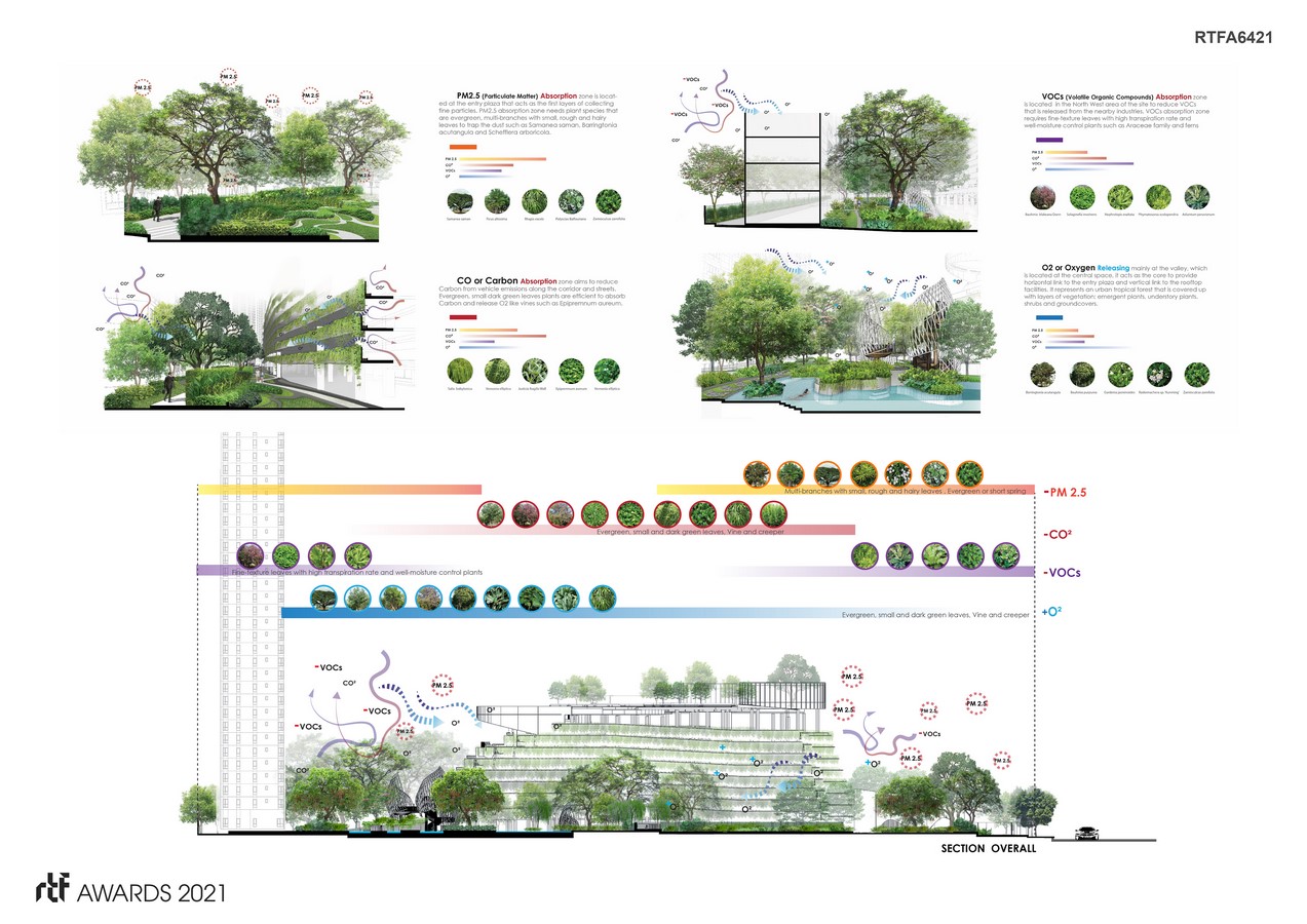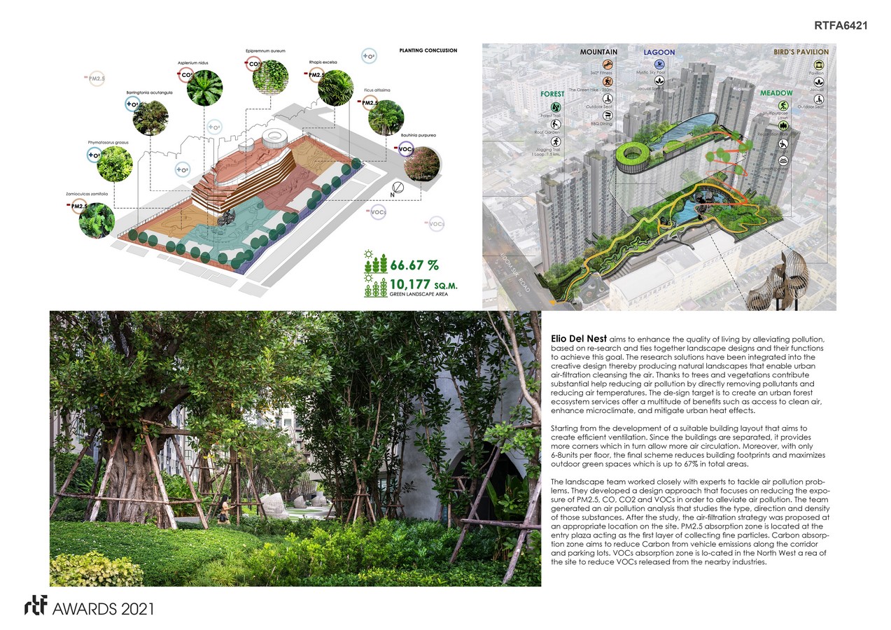 In response to the city’s future development, Elio Del Nest promotes a research-based design centered on the concept of Urban Air-Filtration, that integrates a new modern living with great concern for the environment and residents’ health. Starting from the arrangement of residential buildings. The residential buildings are divided into seven units that stack upwards, mimicking the formation of mountains. The final scheme reduces building footprints and maximizes outdoor green spaces which is up to 67% of the total areas. The landscape team worked closely with experts to tackle air pollution problems, approach that focuses on reducing the exposure of PM2.5, CO, CO2 and VOCs in order to alleviate air pollution. After the study, the air-filtration strategy was proposed at an appropriate location on the site. PM2.5 absorption zone is located at the entry plaza acting as the first layer of collecting fine particles. Carbon absorption zone aims to reduce Carbon from vehicle emissions along the corridor and parking lots. VOCs absorption zone is in the North West area of the site to reduce VOCs released from the nearby industries. we extensively examined plant capabilities and functions that absorb PM2.5, Carbon, VOCs and release O and chose groupings of local planting species appropriately to complement the purpose in each zone.