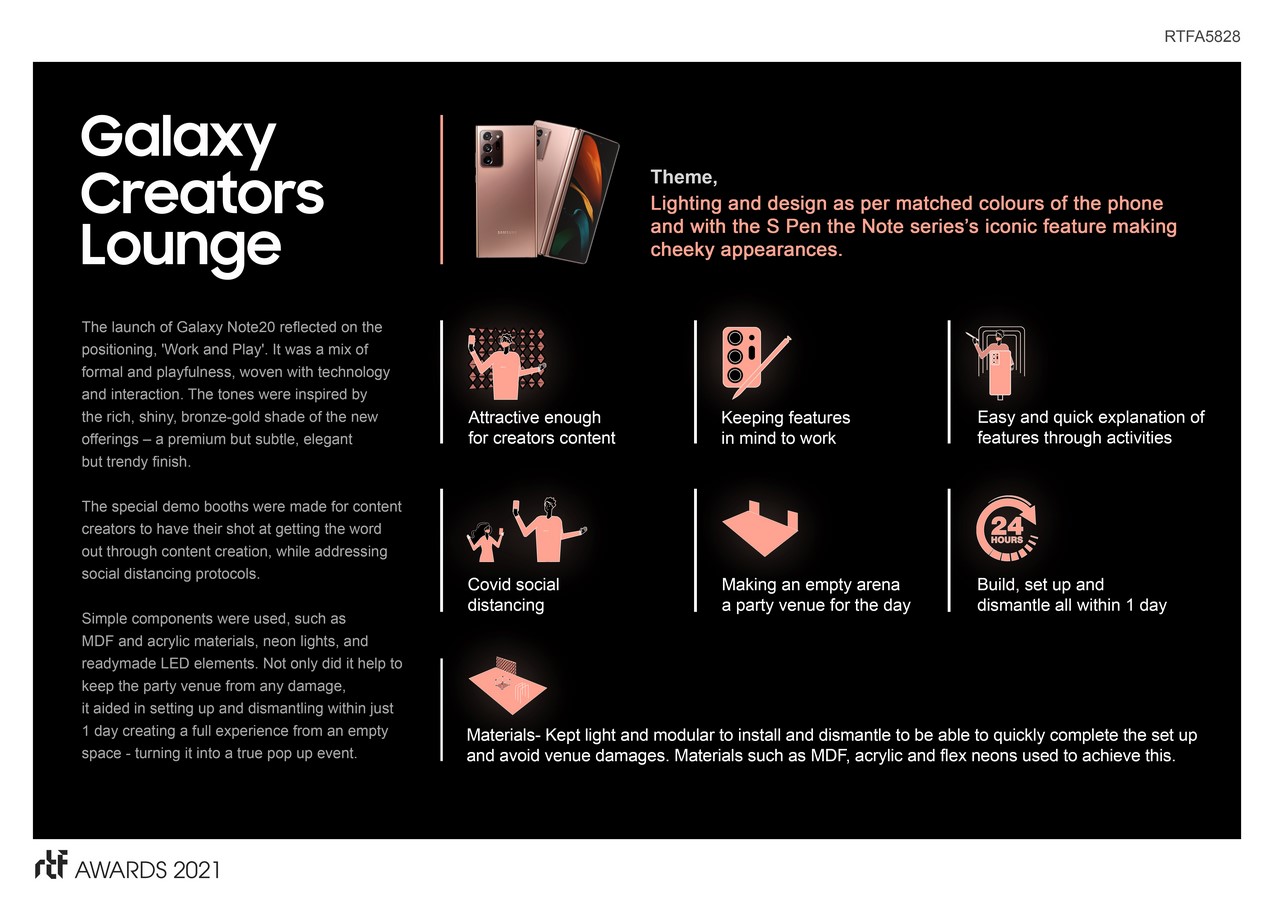 Samsung introduced their much-awaited Galaxy Note20 Series โ a powerhouse for creators, and other devices in the region. And to celebrate, they wanted to throw a Galaxy Creators Lounge party for the influencers, content creators, and other special guests. They wanted the theme to reflect on the design, features and colours of their latest offerings โ bold, attractive, and fun.