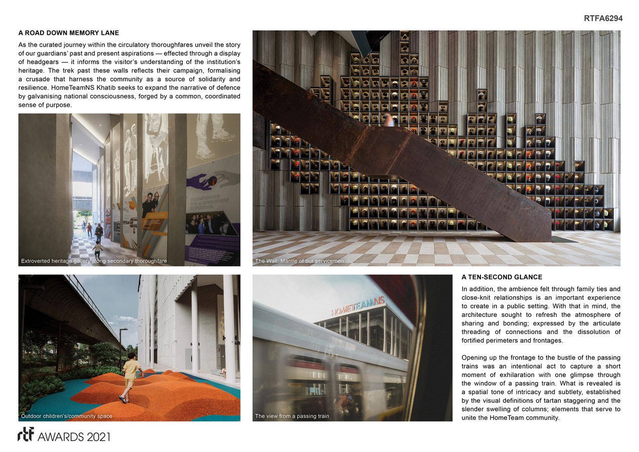 When designing the architectural expression for HomeTeamNS Khatib, the architects sought to capture the emotions and stories of the servicemen. The design embraces their narratives, while being guided by principles that reinvigorate the quintessential constructs of home—security, warmth, and trust; crystalised in a vision: The vessel of community is forged by opening the doors to a house, so that it can be felt as home.
