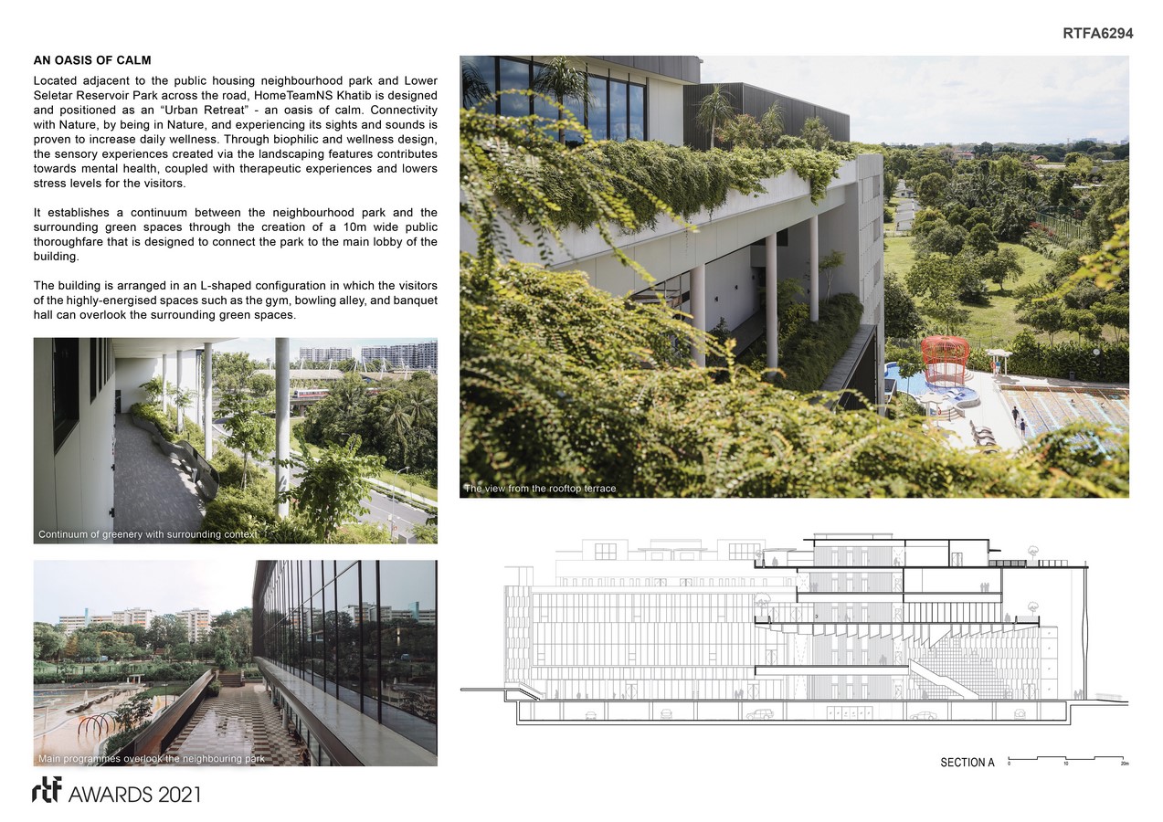 Located adjacent to the HDB neighbourhood park and Lower Seleter Reservoir Park across the road, HomeTeamNS Khatib is designed and positioned as an “Urban Retreat” – an oasis of calm. A continuum is established between the neighbourhood park and the surrounding green spaces through the creation of a 10m wide public thoroughfare that is designed to connect physically from the park to the main lobby of the building. Additionally, visitors of the highly-energised spaces such as the gym, bowling alley and the banquet hall can overlook the surrounding greenery spaces and park.