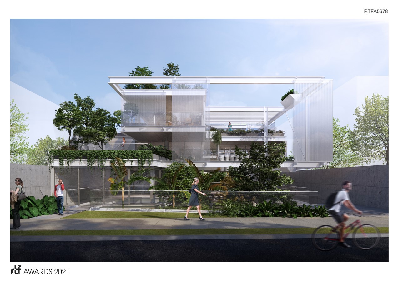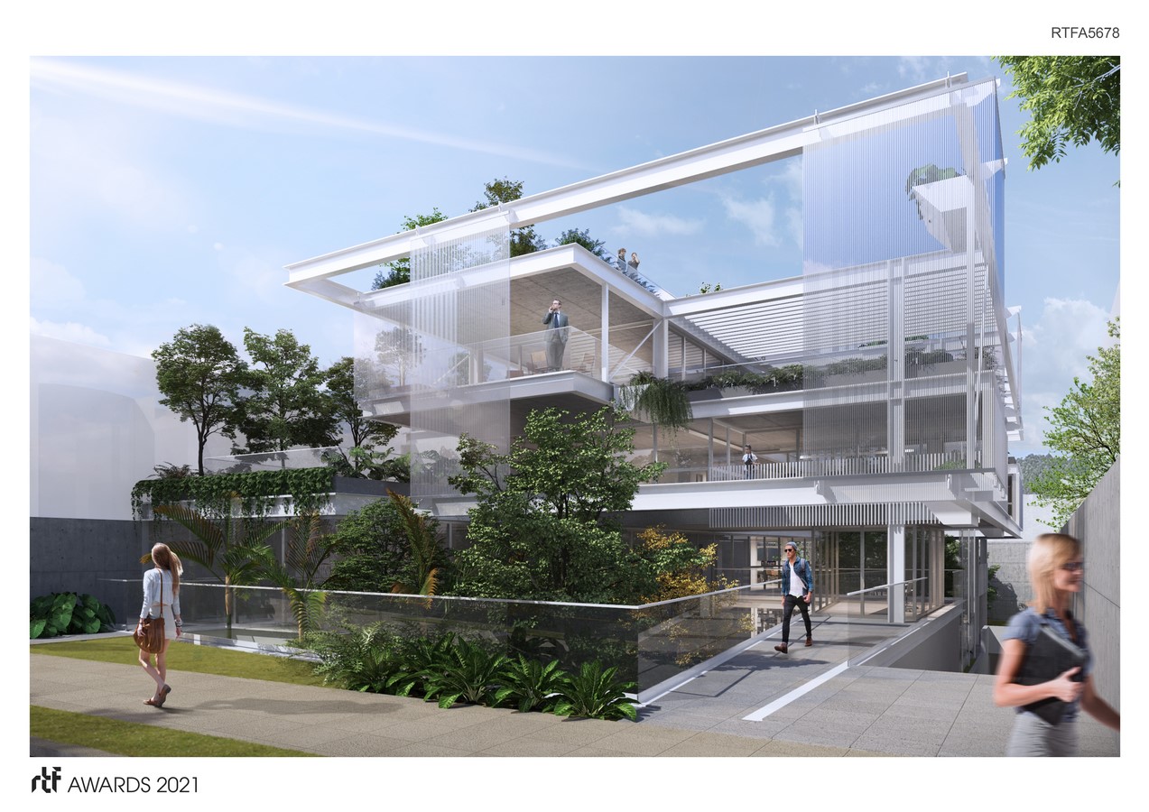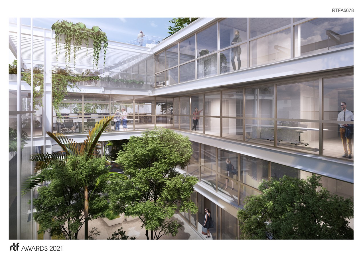 The building was designed in a metallic structure to guarantee large spans with slender and delicate pieces. The same structure also creates supports for tensioned metal brise-soleil, hanging planters and pergolas, guaranteeing thermal comfort and a kind of microclimate for all levels of building.
