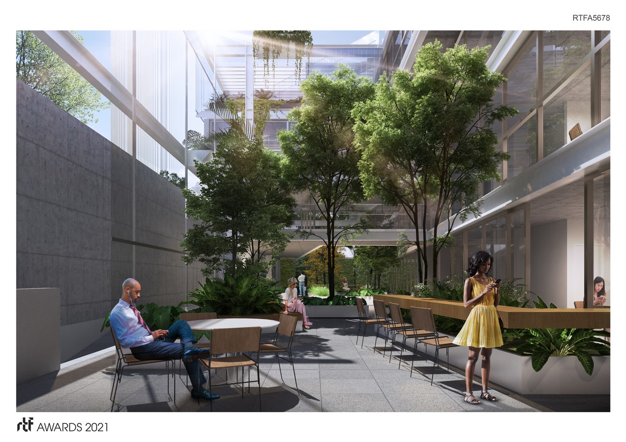The workspace of the Ibira Building seeks to take maximum advantage of the land, creating direct relationships between the workspace and the land, nature and views. Close to Ibirapuera Park, in a place full of sports activities and away from the conventional corporate centers of the São Paulo city, the building is an experience of a new post-pandemic way of working.
